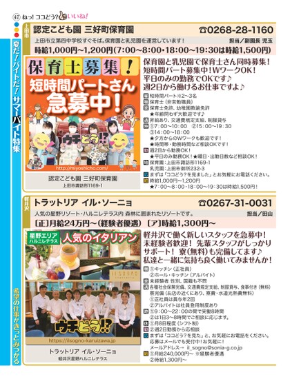 ☎0268-28-1160担当/副園長児玉上田市立第四中学校すぐそば。保育園と乳児園を運営しています!時給1,000円〜1,200円(7:00〜8:00・18:00〜19:30は時給1,500円)保育園と乳児園で保育士さん同時募集!短時間パート募集中!WワークOK!平日のみの勤務でOKです♪週2日から働けるお仕事ですよ♪保育士募集!短時間パートさん認定こども園三好町保育園上田市ねっ!ココどう?☎0267-31-0031担当/田山人気の星野リゾート・ハルニレテラス内森林に囲まれたリゾートです。[正]月給24万円〜(経験者優遇)[ア]時給1,300円〜トラットリアイル・ソーニョ軽井沢星野エリア人気のイタリアンハルニレテラスhttps://ilsogno-karuizawa.jpトラットリアイル・ソーニョ軽井沢星野ハルニレテラス軽井沢で働く新しいスタッフを急募中!未経験者歓迎!先輩スタッフがしっかりサポート!寮(無料)も完備してます♪私達と一緒に気持ち良く働いてみませんか!①キッチン(正社員)②ホール・キッチン(アルバイト)未経験者性別、国籍も不問各種社会保険完備、交通費規定支給、制服貸与、食事付き(無料)寮完備(お店の近くにあり、寮費・水道光熱費無料)①正社員は賞与年2回②アルバイトは社員登用制度あり①9:00〜22:00の間で実働8時間②は1日3〜8時間でご相談に応じます。①月8日程度(シフト制)②週2日勤務から応相談まずは「ココどう?を見た」と、お気軽にお電話をください。応募はメールでも受付中!お気軽に!メールアドレス→il_sogno@sonia-g.co.jp①月給240,000円〜※経験者優遇②時給1,300円〜急募中!http://miyoshicho.com/認定こども園三好町保育園上田市諏訪形1169-1短時間パート※2〜3名保育士(非常勤職員)保育士免許、幼稚園教諭免許★年齢問わず大歓迎です♪昇給あり、交通費規定支給、制服貸与①7:00〜10:00②15:00〜19:30③14:00〜18:00★夕方からのWワークも歓迎です!★時間帯・勤務時間など相談OKです!週2日から勤務OK!★平日のみ勤務OK!★曜日・出勤日数など相談OK!保育園:上田市諏訪形1169-1乳児園:上田市御所232-3まずは「ココどう?を見ました」とお気軽にお電話ください。時給1,000円〜1,200円★7:00〜8:00・18:00〜19:30は時給1,500円!47●●●夏だバイトだ!!希望の仕事がきっとみつかる