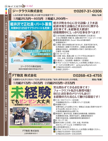 ☎0268-43-4755担当/佐藤男女問わずできるお仕事です♪フォークリフト免許も取得可能!休日とお仕事のメリハリもあり!未経験の方も安心して働ける環境です!①4t・10tドライバー(正社員)②設備輸送及びルート営業スタッフ(正社員)未経験でOK!仕事内容により必要なスキル・資格は入社後に取得できます!まずはお問い合わせください!※普通自動車免許は必要です。昇給あり、賞与年2回、各種社会保険完備、制服貸与交通費規定支給、家族手当あり、退職金制度あり残業代別途支給、各種資格取得支援制度あり8:10〜17:00週休2日制(土日祝)、GW、お盆、年末年始当社カレンダーによる※年間休日112日上田市長瀬1603-1まずは「ココどう?を見ました」とお気軽にお電話ください。①月給210,000円〜300,000円②月給200,000円〜230,000円☎0267-31-0306担当/山本ジークラウス株式会社しなの鉄道「信濃追分駅」から車で5分程度です!①月給25万円〜40万円②時給1,200円〜軽井沢ねっ!ココどう?軽井沢で正社員・パート募集年間休日125日でプライベートも充実!令和4年設立の新しい会社です!新しい仲間を募集中!https://www.gclaus.com/ジークラウス株式会社[軽井沢営業所]軽井沢町追分701-1軽井沢町を中心に住宅設備・上下水道給排水衛生設備など水まわりに関するお仕事です。未経験者大歓迎!研修期間中にしっかり仕事を学べます!①住宅設備工事補助業務及び申請業務(正社員1名)②主に内勤業務(申請)他、設備工事のサポートなど(パート1名)要普通自動車免許、Excel・Wordの基本操作未経験者OK!①昇給・賞与の制度はありませんが、支給予定あります。社用車貸与(通勤での利用可)、各種社会保険完備退職金共済加入、試用期間3ヶ月あり(条件変わらず)②雇用・労災保険①8:15〜17:15①日曜・祝日、隔週土曜※シフトで平日に休日あり!GW、お盆、年末年始※年間休日125日②週3日〜、1日5時間〜勤務OK!(応相談)まずは「ココどう?を見ました」とお気軽にお電話ください。メールからの応募もOK!gclauspnp@gmail.com①月給250,000円〜400,000円②時給1,200円〜大屋駅から丸子に向かい「石井」信号を左折後、坂井」信号を右折し5分程度。①月給21万円〜30万円②月給20万円〜23万円FT物流株式会社上田市未経験でもゼンゼン大丈夫〜試用期間6ヶ月あり(しっかり学べます)〜ご応募お待ちしてます!http://www.ft-butsuryu.co.jp/FT物流株式会社上田市長瀬1603-155●●●ゲンバ系お仕事特集!運ぶ・届ける・建てる・警備する・整備する・メンテナンスする・プラン設計する・農業する・収集廃棄するetc.