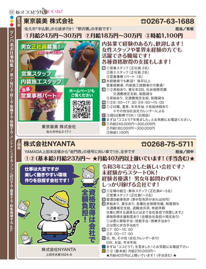 ☎0267-63-1688担当/有坂佐久市「中込駅」から徒歩7分!「野沢橋」の手前です!①月給24万円〜30万円②月給18万円〜30万円③時給1,100円内装業で経験のある方、歓迎します!女性スタッフや業界未経験の方でも活躍できる職場です!各種資格取得の支援もします!男女正社員募集!女性スタッフ活躍中!営業スタッフ内装施工スタッフ急営業事務パート募ホームページもご覧ください東京装美株式会社佐久市中込3-17-1①営業スタッフ(正社員2名)②施エスタッフ(正社員2名)③営業事務(パート1名)未経験者でも歓迎!高卒以上営業経験者、内装施工経験者の方優遇!①②昇給あり、賞与年2回、社会保険完備交通費規定支給、制服貸与③昇給あり、交通費規定支給、制服貸与①②8:00〜17:30③9:00〜15:00①②日曜、夏季、年末年始※有給休暇あり※その他当社会社カレンターによる③週5日勤務でOK!(応相談)まずは「ココどう?を見ました」とお気軽にお電話ください。①月給240,000円〜300,000円②月給180,000円〜300,000円③時給1,100円東京装美株式会社佐久市ねっ!ココどう?担当/田中YAMADA上田本店様から「岩門西」の信号に向い車で1分、左手です①②(基本給)月給23万円〜★月給40万円以上稼いでいます!(手当含む)★☎0268-75-5711株式会社NYANTA上田市令和3年に設立した新しい会社です♪未経験からスタートOK!経験者優遇!男女年齡問わずOK!しっかり稼げる会社です!①足場の組立・解体スタッフ(正社員4〜5名)②営業スタッフ(正社員1〜2名)普通自動車免許(準中型免許があれば尚可)昇給あり、賞与あり、各種社会保険完備、制服貸与交通費規定支給、退職金共済、有給休暇仕事に関する道具などは全て会社負担で用意します♪資格取得支援制度あり(全額会社負担※規定あり)①は更に資格手当・技能手当・残業手当あり②は更に歩合手当あり①7:00〜16:00②8:00〜17:00日、祝、その他(会社カレンダーあり)GW、お盆、年末年始まずは「ココどう?」を見ました!とお気軽にお電話下さい①②(基本給)月給230,000円〜★月給40万円以上稼いでいます!(手当含む)★資格取得は会社で全額負担!仕事は大変ですが楽しく働きやすい環境作りを目指す会社です!株式会社NYANTA上田市古里1624-657●●●ゲンバ系お仕事特集!運ぶ・届ける・建てる・警備する・整備する・メンテナンスする・プラン設計する・農業する・収集廃棄するetc.
