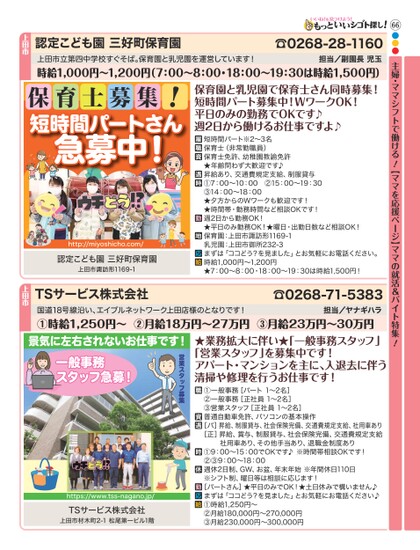 ●●●66主婦・ママシフトで働ける!【ママを応援ページ】ママの就活&バイト特集!短時間パート※2〜3名保育士(非常勤職員)保育士免許、幼稚園教諭免許★年齢問わず大歓迎です♪昇給あり、交通費規定支給、制服貸与①7:00〜10:00②15:00〜19:30③14:00〜18:00★夕方からのWワークも歓迎です!★時間帯・勤務時間など相談OKです!週2日から勤務OK!★平日のみ勤務OK!★曜日・出勤日数など相談OK!保育園:上田市諏訪形1169-1乳児園:上田市御所232-3まずは「ココどう?を見ました」とお気軽にお電話ください。時給1,000円〜1,200円★7:00〜8:00・18:00〜19:30は時給1,500円!担当/副園長児玉上田市立第四中学校すぐそば。保育園と乳児園を運営しています!時給1,000円〜1,200円(7:00〜8:00・18:00〜19:30は時給1,500円)保育園と乳児園で保育士さん同時募集!短時間パート募集中!WワークOK!平日のみの勤務でOKです♪週2日から働けるお仕事ですよ♪保育士募集!短時間パートさん☎0268-28-1160認定こども園三好町保育園上田市急募中!国道18号線沿い、エイブルネットワーク上田店様のとなりです!①時給1,250円〜②月給18万円〜27万円③月給23万円〜30万円担当/ヤナギハラ★業務拡大に伴い★「一般事務スタッフ」「営業スタッフ」を募集中です!アパート・マンションを主に、入退去に伴う清掃や修理を行うお仕事です!①一般事務[パート1〜2名]②一般事務[正社員1〜2名]③営業スタッフ[正社員1〜2名]普通自動車免許、パソコンの基本操作[パ]昇給、制服貸与、社会保険完備、交通費規定支給、社用車あり[正]昇給、賞与、制服貸与、社会保険完備、交通費規定支給社用車あり、その他手当あり、退職金制度あり①9:00〜15:00でOKです♪※時間帯相談OKです!②③9:00〜18:00週休2日制、GW、お盆、年末年始※年間休日110日※シフト制、曜日等は相談に応じます![パートさん]★平日のみでOK!★土日休みで構いません♪まずは「ココどう?を見ました」とお気軽にお電話ください♪①時給1,250円〜②月給180,000円〜270,000円③月給230,000円〜300,000円営業スタッフ募集一般事務スタッフ急募!景気に左右されないお仕事です!https://www.tss-nagano.jp/TSサービス株式会社上田市材木町2-1松尾第一ビル1階☎0268-71-5383TSサービス株式会社上田市http://miyoshicho.com/認定こども園三好町保育園上田市諏訪形1169-1