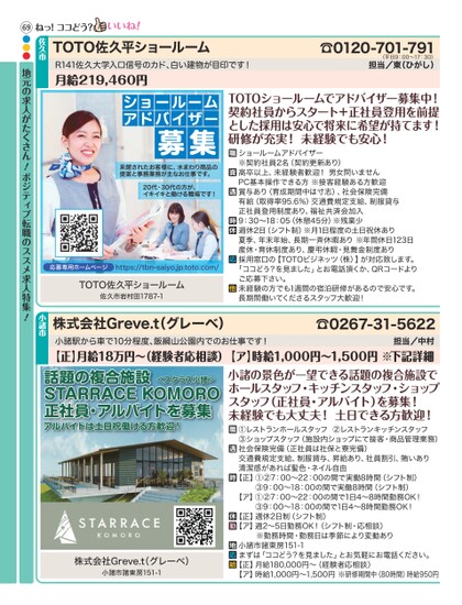 アルバイトは土日祝働ける方歓迎!TOTO佐久平ショールームR141佐久大学入口信号のカド、白い建物が目印です!月給219,460円☎0120-701-791(平日9:00〜17:30)担当/東(ひがし)ショールームアドバイザー募集来館されたお客様に、水まわり商品の提案と事務業務が主なお仕事です。20代・30代の方が、イキイキと働ける職場です!応募専用ホームページhttps://tbn-saiyo.jp.toto.com/TOTO佐久平ショールーム佐久市岩村田1787-1TOTOショールームでアドバイザー募集中!契約社員からスタート+正社員登用を前提とした採用は安心で将来に希望が持てます!研修が充実!未経験でも安心!ショールームアドバイザー※契約社員2名(契約更新あり)高卒以上、未経験者歓迎!男女問いませんPC基本操作できる方※接客経験ある方歓迎賞与あり(育成期間中は寸志)、社会保険完備有給(取得率95.6%)交通費規定支給、制服貸与正社員登用制度あり、福祉共済会加入9:30〜18:05(休憩45分)※残業少週休2日(シフト制)※月1日程度の土日祝休あり夏季、年末年始、長期一斉休暇あり※年間休日123日産休・育休制度あり、慶弔休暇・見舞金制度あり採用窓口の【TOTOビジネッツ(株)】が対応致します。「ココどう?を見ました」とお電話頂くか、QRコードよりご応募下さい。未経験の方でも1週間の宿泊研修があるので安心です。長期間働いてくださるスタッフ大歓迎!☎0267-31-5622株式会社Greve.t(グレーベ)小諸市小諸駅から車で10分程度、飯綱山公園内でのお仕事です!担当/中村【正】月給18万円〜(経験者応相談)【ア】時給1,000円〜1,500円※下記詳細話題の複合施設小諸の景色が一望できる話題の複合施設でホールスタッフ・キッチンスタッフ・ショップSTARRACEKOMOROスタッフ(正社員・アルバイト)を募集!正社員・アルバイトを募集未経験でも大丈夫!土日できる方歓迎!<スタラス小諸>69ねっ!ココどう?佐久市●●●地元の求人がたくさん!ポジティブ転職のススメ求人特集!①レストランホールスタッフ②レストランキッチンスタッフ③ショップスタッフ(施設内ショップにて接客・商品管理業務)社会保険完備(正社員は社保と寮完備)交通費規定支給、制服貸与、昇給あり、社員割引、賄いあり清潔感があれば髪色・ネイル自由【正】①②7:00〜22:00の間で実働8時間(シフト制)③9:00〜18:00の間で実働8時間(シフト制)【ア】①②7:00〜22:00の間で1日4〜8時間勤務OK!③9:00〜18:00の間で1日4〜8時間勤務OK!【正】週休2日制(シフト制)【ア】週2〜5日勤務OK!(シフト制・応相談)※勤務時間・勤務日は季節により変動あり小諸市諸東房151-1まずは「ココどう?を見ました」とお気軽にお電話ください。【正】月給180,000円〜(経験者応相談)【ア】時給1,000円〜1,500円※研修期間中(80時間)時給950円株式会社Greve.t(グレーベ)小諸市諸東房151-1