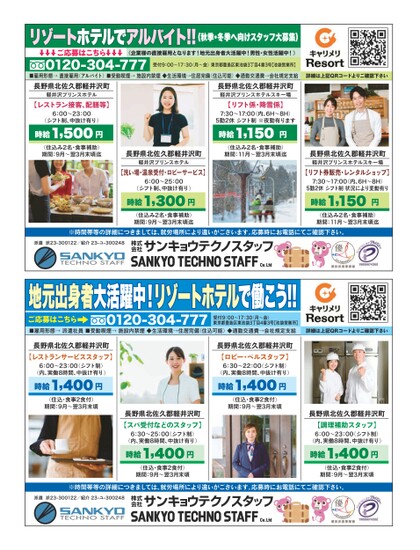 リゾートホテルでアルバイト!!(秋季・冬季へ向けスタッフ大募集)《企業様の直接雇用となります!地元出身者大活躍中!男性・女性活躍中!》ご応募はこちら受付9:00〜17:30(月〜金)東京都豊島区東池袋3丁目4番3号【池袋営業所】0120-304-777■雇用形態→直接雇用(アルバイト)■受動喫煙→施設内禁煙◆生活環境→住居完備(住込可能)◆通勤交通費→会社規定支給長野県北佐久郡軽井沢町軽井沢プリンスホテル長野県北佐久郡軽井沢町軽井沢プリンスホテルスキー場【リフト係・降雪係】7:30〜17:00(内、6H〜8H)5勤2休シフト制※夜勤有ります時給1,150円(住込み2名・食事補助)期間:11月〜翌3月末頃【レストラン接客、配膳等】6:00〜23:00(シフト制、中抜け有り)時給1,500円(住込み2名・食事補助)期間:9月〜翌3月末頃長野県北佐久郡軽井沢町軽井沢プリンスホテル【洗い場・温泉受付・ロビーサービス】6:00〜25:00(シフト制、中抜け有り)時給1,300円(住込み2名・食事補助)期間:9月〜翌3月末頃詳細は上記QRコードよりご確認下さい長野県北佐久郡軽井沢町軽井沢プリンスホテルスキー場【リフト券販売・レンタルショップ】7:30〜17:00(内、6H〜8H)5勤2休シフト制状況により変動有り時給1,150円(住込み2名・食事補助)期間:11月〜翌3月末頃※時間帯等の詳細につきましては、就労場所により違いがございます。応募時にお電話にてご確認下さい。派遣派23-300122/紹介23-ユ-300248地元出身者大活躍中!リゾートホテルで働こう!!0120-304-777■雇用形態→派遣社員■受動喫煙→施設内禁煙◆生活環境→住居完備(住込可能)◆通勤交通費→会社規定支給受付9:00〜17:30(月〜金)東京都豊島区東池袋3丁目4番3号【池袋営業所】ご応募はこちら長野県北佐久郡軽井沢町【ロビー・ベルスタッフ】6:30〜22:00(シフト制)(内、実働8時間、中抜け有り)時給1,400円(住込・食事2食付)期間:9月〜翌3月末頃長野県北佐久郡軽井沢町【レストランサービススタッフ】6:00〜23:00(シフト制)(内、実働8時間、中抜け有り)時給1,400円(住込・食事2食付)期間:9月〜翌3月末頃長野県北佐久郡軽井沢町【スパ受付などのスタッフ】6:30〜25:00(シフト制)(内、実働8時間、中抜け有り)時給1,400円(住込・食事2食付)期間:9月〜翌3月末頃詳細は上記QRコードよりご確認下さい長野県北佐久郡軽井沢町【調理補助スタッフ】6:00〜23:00(シフト制)(内、実働8時間、中抜け有り)時給1,400円(住込・食事2食付)期間:9月〜翌3月末頃※時間帯等の詳細につきましては、就労場所により違いがございます。応募時にお電話にてご確認下さい。派遣派23-300122/紹介23-ユ-300248