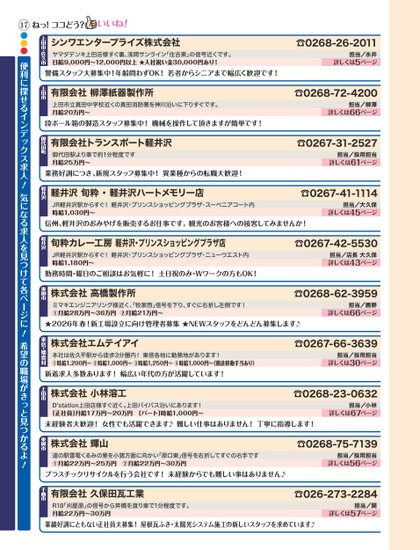 ☎0268-26-2011担当/永井詳しくは5ページ☎0268-72-4200担当/柳澤詳しくは66ページ☎0267-31-2527担当/採用担当詳しくは61ページ警備スタッフ大募集中!年齢問わずOK!若者からシニアまで幅広く歓迎です!シンワエンタープライズ株式会社ヤマダデンキ上田店様すぐ裏、浅間サンライン「住吉東」の信号近くです。日給9,000円〜12,000円以上★入社祝い金30,000円あり!上田市・佐久市段ボール箱の製造スタッフ募集中!機械を操作して頂きますが簡単です!有限会社柳澤紙器製作所上田市立真田中学校近くの真田消防署を神川沿いに下りすぐです。月給20万円〜上田市業務好調につき、新規スタッフ募集中!異業種からの転職大歓迎!有限会社トランスポート軽井沢御代田駅より車で約1分程度です月給25万円〜御代田町☎0267-41-1114担当/大久保詳しくは45ページ軽井沢旬粋・軽井沢ハートメモリー店JR軽井沢駅からすぐ!軽井沢・プリンスショッピングプラザ・スーベニアコート内時給1,030円〜軽井沢信州、軽井沢のおみやげを販売するお仕事です。観光のお客様への接客してみませんか!☎0267-42-5530担当/店長大久保詳しくは43ページ☎0268-62-3959担当/鹿野詳しくは66ページ勤務時間・曜日のご相談はお気軽に!土日祝のみ・Wワークの方もOK!旬粋カレー工房軽井沢・プリンスショッピングプラザ店JR軽井沢駅からすぐ!軽井沢・プリンスショッピングプラザ・ニューウエスト内時給1,180円〜軽井沢株式会社高橋製作所ミマキエンジニアリング様近く、牧家西」信号を下り、すぐに右折し左側です!①月給28万円〜36万円②月給21万円〜東御市★2026年春!新工場設立に向け管理者募集★NEWスタッフをどんどん募集します♪☎0267-66-3639担当/採用担当詳しくは30ページ☎0268-23-0632担当/小林詳しくは67ページ株式会社エムテイアイ本社は佐久平駅から徒歩3分圏内!東信各地に勤務地があります!①時給1,200円〜②時給1,000円〜③時給1,250円〜④時給1,000円〜(別途移動手当あり)東信・嬬恋村新着求人多数あります!幅広い年代の方が活躍しています!株式会社小林溶工D'station上田店様すぐ近く。上田バイパス沿いにあります![正社員]月給17万円〜20万円[パート]時給1,000円〜上田市未経験者大歓迎!女性でも活躍できます♪難しい仕事はありません!丁寧に指導します!☎0268-75-7139担当/採用担当詳しくは56ページ☎026-273-2284担当/関詳しくは57ページプラスチックリサイクルを行う会社です!未経験からでも難しい事はありません♪株式会社輝山道の駅雷電くるみの里を小諸方面に向かい「原口東」信号を右折してすぐの右手です①月給22万円〜25万円②月給22万円〜30万円東御市有限会社久保田瓦工業R18「刈屋原」の信号から笄橋を渡り車で1分程度です。月給22万円〜30万円千曲市業績好調にともない正社員大募集!屋根瓦ふき・太陽光システム施工の新しいスタッフを求めています♪ねっ!ココどう?17●●●便利に探せるインデックス求人!気になる求人を見つけて各ページに!希望の職場がきっと見つかるよ!