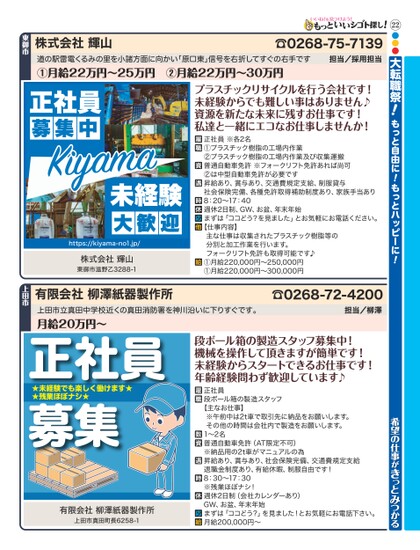 22●●●大転職祭!もっと自由に!もっとハッピーに!☎0268-75-7139担当/採用担当道の駅雷電くるみの里を小諸方面に向かい「原口東」信号を右折してすぐの右手です①月給22万円〜25万円②月給22万円〜30万円正社員募集中未経験大歓迎https://kiyama-no1.jp/株式会社輝山東御市滋野乙3288-1プラスチックリサイクルを行う会社です!未経験からでも難しい事はありません♪資源を新たな未来に残すお仕事です!私達と一緒にエコなお仕事しませんか!正社員※各2名①プラスチック樹脂の工場内作業②プラスチック樹脂の工場内作業及び収集運搬普通自動車免許※フォークリフト免許あれば尚可②は中型自動車免許が必要です昇給あり、賞与あり、交通費規定支給、制服貸与社会保険完備、各種免許取得補助制度あり、家族手当あり8:20〜17:40週休2日制、GW、お盆、年末年始まずは「ココどう?を見ました」とお気軽にお電話ください。【仕事内容】主な仕事は収集されたプラスチック樹脂等の分別と加工作業を行います。フォークリフト免許も取得可能です♪①月給220,000円〜250,000円①月給220,000円〜300,000円株式会社輝山東御市希望の仕事がきっとみつかる段ボール箱の製造スタッフ募集中!機械を操作して頂きますが簡単です!未経験からスタートできるお仕事です!年齢経験問わず歓迎しています♪正社員段ボール箱の製造スタッフ【主なお仕事】※午前中は2t車で取引先に納品をお願いします。その他の時間は会社内で製造をお願いします。1〜2名普通自動車免許(AT限定不可)※納品用の2t車がマニュアルの為昇給あり、賞与あり、社会保険完備、交通費規定支給退職金制度あり、有給休暇、制服自由です!8:30〜17:30※残業ほぼナシ!週休2日制(会社カレンダーあり)GW、お盆、年末年始まずは「ココどう?」を見ました!とお気軽にお電話下さい。月給200,000円〜★未経験でも楽しく働けます★★残業ほぼナシ★正社員募集有限会社柳澤紙器製作所上田市真田町長6258-1☎0268-72-4200担当/柳澤上田市立真田中学校近くの真田消防署を神川沿いに下りすぐです。月給20万円〜有限会社柳澤紙器製作所上田市