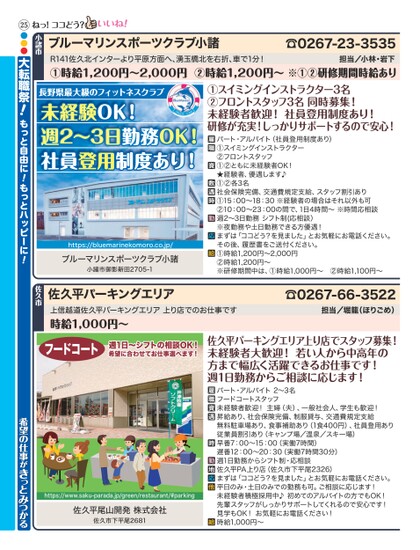 ☎0267-23-3535ブルーマリンスポーツクラブ小諸小諸市ねっ!ココどう?担当/小林・岩下R141佐久北インターより平原方面へ、湧玉橋北を右折、車で1分!①時給1,200円〜2,000円②時給1,200円〜※①②研修期間時給あり長野県最大級のフィットネスクラブ未経験OK!週2〜3日勤務OK!社員登用制度あり!用https://bluemarinekomoro.co.jp/ブルーマリンスポーツクラブ小諸小諸市御影新田2705-1①スイミングインストラクター3名②フロントスタッフ3名同時募集!未経験者歓迎!社員登用制度あり!研修が充実!しっかりサポートするので安心!パート・アルバイト(社員登用制度あり)①スイミングインストラクター②フロントスタッフ①②ともに未経験者OK!★経験者、優遇します♪①②各3名社会保険完備、交通費規定支給、スタッフ割引あり①15:00〜18:30※経験者の場合はそれ以外も可②10:00〜23:00の間で、1日4時間〜※時間応相談週2〜3日勤務シフト制(応相談)※夜勤務や土日勤務できる方優遇!まずは「ココどう?を見ました」とお気軽にお電話ください。その後、履歴書をご送付ください。①時給1,200円〜2,000円②時給1,200円〜※研修期間中は、①時給1,000円〜②時給1,100円〜☎0267-66-3522担当/堀籠(ほりごめ)佐久平パーキングエリア上信越道佐久平パーキングエリア上り店でのお仕事です時給1,000円〜佐久市佐久平パーキングエリア上り店でスタッフ募集!未経験者大歓迎!若い人から中高年の方まで幅広く活躍できるお仕事です!週1日勤務からご相談に応じます!パート・アルバイト2〜3名フードコートスタッフ未経験者歓迎!主婦(夫)、一般社会人、学生も歓迎!昇給あり、社会保険完備、制服貸与、交通費規定支給無料駐車場あり、食事補助あり(1食400円)、社員登用あり従業員割引あり(キャンプ場/温泉/スキー場)早番7:00〜15:00(実働7時間)遅番12:00〜20:30(実働7時間30分)週1日勤務からシフト制・応相談佐久平PA上り店(佐久市下平尾2326)まずは「ココどう?を見ました」とお気軽にお電話ください。平日のみ・土日のみでの勤務も可。ご相談に応じます!未経験者積極採用中♪初めてのアルバイトの方でもOK!先輩スタッフがしっかりサポートしてくれるので安心です!見学もOK!お気軽にお電話ください!時給1,000円〜フードコート週1日〜シフトの相談OK!希望に合わせてお仕事選べます!https://www.saku-parada.jp/green/restaurant/#parking佐久平尾山開発株式会社佐久市下平尾2681希望の仕事がきっとみつかる25●●●大転職祭!もっと自由に!もっとハッピーに!