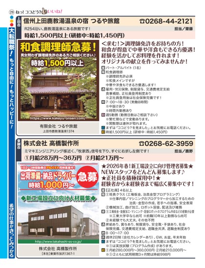 信州上田鹿教湯温泉の宿つるや旅館R254沿い、鹿教湯温泉にある旅館です!時給1,500円以上(研修中:時給1,450円)☎0268-44-2121担当/齋藤和食調理師急募!男女問わず調理師免許のある方ご相談ください♪時給1,500円以上https://www.kakeyu-onsen.com/有限会社つるや旅館上田市鹿教湯温泉1374<求む!>調理師免許をお持ちの方!和食が得意で中華や洋食もできる方優遇!経験を活かしてお料理を作れます!オリジナルの献立を作ってみませんか!パート・アルバイト(1名)和食調理師※調理師免許必須※和食メインですが中華や洋食もできる方優遇します!雇用・労災保険、制服貸与、交通費規定支給食事補助、正社員登用制度あり※正社員登用後は社会保険完備です!7:00〜18:30(実働8時間)※中抜けあり※時間外勤務あり週5勤務(勤務日数はご相談下さい)※繁忙期などで変動あります。※閑散期は連休が取れます。まずは「ココどう?を見ました」とお気軽にお電話ください。時給1,500円以上(研修中:時給1,450円)大転職祭!もっと自由に!もっとハッピーに!ねっ!ココどう?上田市29●●●☎0268-62-3959担当/鹿野ミマキエンジニアリング様近く、牧家西」信号を下り、すぐに右折し左側です!①月給28万円〜36万円②月給21万円〜株式会社高橋製作所東御市★2026年春!新工場設立に向け管理者募集★NEWスタッフをどんどん募集します♪★正社員を積極採用中!★経験者から未経験者まで幅広く募集中です!【正社員】4名以上①班長クラス(工場板金、治具金型プログラミング)※仕事内容/マシニングのプログラマーから加工するための治具・金型の作成、若手への指導、安全教育②機械加工、曲げ加工、ロボット溶接、配送及び雑務①工場板金・旋盤加工・マシニング・溶接ロボットのプログラム作成などの経験が必要※工業大学卒なら尚可※前職10年以上勤務なら尚可②未経験でも大丈夫、その他不問昇給あり、賞与あり、制服貸与、安全靴・手袋あり、社会保険完備、交通費規定支給、退職金共済、退職金制度あり8:00〜17:00週休2日制(会社カレンダーあり)、GW、お盆、年末年始まずは「ココどう?を見ました」とお気軽にお電話ください。※①は実技試験(プログラム作成)があります。①月給280,000円〜360,000円②月給210,000円〜※①②ともに試用期間3ヶ月間は時給998円1日2〜3時間勤務のアルバイト同時募集中!出荷準備・納品ドライバー急募時給1,000円〜◆新工場設立に向け人材募集◆http://www.takahashi-ss-co.jp/株式会社高橋製作所[本社]東御市加沢1367-1希望の仕事がきっとみつかる