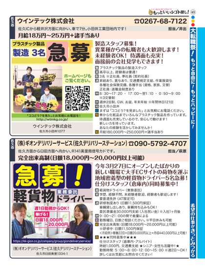 40●●●大転職祭!もっと自由に!もっとハッピーに!☎0267-68-7122担当/井出佐久ICから軽井沢方面に向かい、車で7分。小田井工業団地内です!月給18万円〜25万円+諸手当ありウインテック株式会社佐久市プラスチック製品製造3名急募ホームページもご覧ください。「ココどう?を見た」とお気軽にお電話を!http://wtmkg.co.jp/ウインテック株式会社佐久市小田井1077製造スタッフ募集!異業種からの転職者も大歓迎します!未経験者OK!待遇面も充実!面接前の会社見学もできます!プラスチック製品の製造スタッフ高卒以上、経験者は優遇!3名※正社員、準社員(契約社員)昇給あり、賞与あり、交通費規定支給、作業服貸与各種社会保険完備、各種手当(資格、家族、交替)正社員:退職金制度あり8:30〜17:20・17:00〜翌1:10・0:50〜9:00※3交替制週休2日制、GW、お盆、年末年始※年間休日121日佐久市小田井まずは「ココどう?を見ました」とお気軽にお電話ください。車から化粧品までいろんなプラスチック製品を作っています。待遇面も充実しているので、安心して働けます!新しい力を待っています。あなたの経験を活かしてみませんか!月給180,000円〜250,000円+諸手当あり希望の仕事がきっとみつかる軽貨物ドライバー(業務委託)学歴、経験不問、未経験者歓迎、経験者も歓迎します!要普通免許(AT限定可)研修制度あり(日額11,500円保証)車輛貸し出しあり、車輛持ち込みもOK!委託準備金30,000円支給(入社祝い金)※入社1ヶ月後9:00〜21:00の間で裁量による勤務曜日、日数ご相談ください。※平日休みも可能完全出来高制(日額18,000円〜20,000円以上可能)※研修中:日額11,500円保証<月収例>稼働22日×日額20,000円以上=月収440,000円以上可能!★★★同時募集中★★★仕分けスタッフ(倉庫内・アルバイト)時給1,000円、交通費支給★シニア・女性も活躍中!★勤務時間:5:00〜8:00・12:00〜15:00※週2日〜OK!詳しくはお気軽にお問合せください!今年3月27日にオープンしたばかりの新しい職場で大手ECサイトの荷物を運ぶ地域密着型の軽貨物ドライバー5名急募!仕分けスタッフ(倉庫内)同時募集中!急募!業務委託軽貨物ドライバー週1日勤務からOK!稼げる!日額18,000円〜20,000円https://kk-gion.co.jp/company/group/giondeliveryservice/(株)ギオンデリバリーサービス(佐久デリバリーステーション)佐久市臼田美里1334-1佐久方面から臼田方面へ向かい、R141美里南信号カドです。完全出来高制(日額18,000円〜20,000円以上可能)担当/萩原☎090-5792-4707(株)ギオンデリバリーサービス(佐久デリバリーステーション)佐久市
