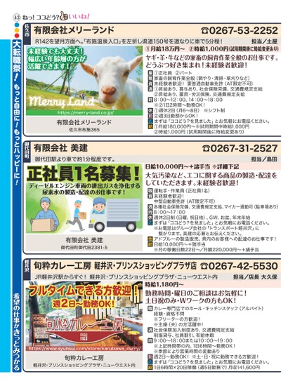 R142を望月方面へ。布施温泉入口」を左折し県道150号を道なりに車で5分程!担当/土屋☎0267-53-2252①月給18万円〜②時給1,000円(試用期間後に時給変更あり)ヤギ・羊・牛などの家畜の飼育作業全般のお仕事です。どうぶつ好き集まれ!未経験者歓迎!①正社員②パート家畜の飼育作業全般(やり・清掃・草刈りなど)未経験者歓迎!要普通自動車免許(AT限定不可)①昇給あり、賞与あり、社会保険完備、交通費規定支給②昇給あり、雇用・労災保険、交通費規定支給8:00〜12:00、14:00〜18:00※②1日2時間〜勤務OK!①週休2日(月6〜8日)※シフト制②週3日勤務からOK!まずは「ココどう?を見ました」とお気軽にお電話ください。①月給180,000円〜※試用期間中時給1,000円②時給1,000円(試用期間後に時給変更あり)☎0267-31-2527担当/島田日給10,000円〜+諸手当※詳細下記大気汚染など、エコに関する商品の製造・配達をしていただきます。未経験者歓迎!運転手・作業員(正社員1名)未経験者歓迎!中型自動車免許(AT限定不可)各種社会保険完備、交通費規定支給、マイカー通勤可(駐車場あり)8:00〜17:00週休2日制(日曜、祝日他)、GW、お盆、年末年始まずは「ココどう?を見ました」とお気軽にお電話ください。※お電話はグループ会社の「トランスポート軽井沢」に繋がります。美建の応募とお伝えください。アドブルーの製造販売、県内のお客様への配達のお仕事です!日給10,000円〜+諸手当※月の稼働日数22日〜/月額220,000円〜+諸手当JR軽井沢駅からすぐ!軽井沢・プリンスショッピングプラザ・ニューウエスト内担当/店長大久保☎0267-42-5530旬粋カレー工房軽井沢・プリンスショッピングプラザ店軽井沢フルタイムできる方歓迎!週2日〜勤務OK!https://www.syunsui.com/store/karuizawa_curry/旬粋カレー工房軽井沢・プリンスショッピングプラザ・ニューウエスト内時給1,180円〜勤務時間・曜日のご相談はお気軽に!土日祝のみ・Wワークの方もOK!カレー専門店でのホール・キッチンスタッフ(アルバイト)経験・資格不問※フリーターの方歓迎!※主婦(夫)の方活躍中!社会保険加入制度あり、交通費規定支給制服貸与、社員割引、有給休暇9:00〜18:00または10:00〜19:00※上記時間帯の内、1日6時間〜勤務OK!※季節により営業時間の変動あり週2日〜勤務OK!※土・日・祝に勤務できる方歓迎!まずは「ココどう?を見ました」とお気軽にお電話ください。1日6時間×20日稼働(週5日勤務で)月収141,600円御代田駅より車で約1分程度です。正社員1名募集!ディーゼルエンジン車両の排出ガスを浄化する尿素水の製造・配達のお仕事です!御代田町有限会社美建有限会社美建御代田町御代田2381-5有限会社メリーランド佐久市ねっ!ココどう?未経験でも大丈夫!幅広い年齢層の方が活躍できます!https://merry-land.co.jp/有限会社メリーランド佐久市布施36543●●●大転職祭!もっと自由に!もっとハッピーに!希望の仕事がきっとみつかる