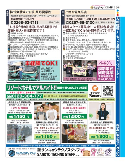 46●●●もっと自由に!もっとハッピーに!希望の仕事がきっとみつかる大転職祭!☎0267-66-3100佐久平駅目の前!通勤も便利です!①時給1,005円〜(詳細下記)②時給1,045円担当/原田・三浦・坂本新規スタッフ募集中!未経験者歓迎!一緒に働いてくれる仲間を待っています。イオン佐久平店佐久市①子ども服売り場スタッフ②お惣菜売場スタッフ※パート従業員大募集!未経験者歓迎交通費支給、昇給・賞与あり、お買物割引制度(サポートパートナー除く)※いずれも当社規定による9:00〜22:00の間で、1日4〜6時間から応相談シフト制、週2日勤務から応相談、年次有給休暇あり①9:00〜17:00時給1,005円/17:00〜19:00時給1,105円19:00〜時給1,205円②8:00〜17:00時給1,045円イオン佐久平店佐久市佐久平駅南11-10株式会社まるすぎ長野営業所塩沢産業様から上田方面に向かいすぐです!左手にあり!月給19万円〜25万円東御市☎0268-63-7111担当/小森主に携帯会社の基地局に関わるお仕事です!運搬・搬入・搬出作業です!正社員1〜2名トラックドライバー※運搬及び搬入・搬出作業になります。普通自動車免許でOK!(中型自動車免許あれば尚可)昇給あり、賞与あり(年2回)、交通費規定支給、制服貸与退職金制度あり、資格取得支援制度あり8:00〜17:00※多少の残業があります。完全週休2日制、祝日、GW、お盆、年末年始※年間125日まずは「ココどう?を見ました」とお気軽にお電話ください。月給190,000円〜250,000円※稼ぎたい方は、月給25万円以上可能です♪株式会社まるすぎ長野営業所東御市加沢404-1未経験でOK!会社負担で★人間ドック★脳ドックが受診できます!※入社2年目以降まずは「を見ました」とお電話下さい。調剤事務同時募集未経験者歓迎時給1,055円〜https://www.marusugi-9111.co.jpリゾートホテルでアルバイト!!(秋季・冬季へ向けスタッフ大募集)《企業様の直接雇用となります!地元出身者大活躍中!男性・女性活躍中!》ご応募はこちら受付9:00〜17:30(月〜金)東京都豊島区東池袋3丁目4番3号【池袋営業所】0120-304-777■雇用形態→直接雇用(アルバイト)■受動喫煙→施設内禁煙◆生活環境→住居完備(住込可能)◆通勤交通費→会社規定支給長野県北佐久郡軽井沢町軽井沢プリンスホテルスキー場長野県北佐久郡軽井沢町軽井沢プリンスホテル【リフト係・降雪係】7:30〜17:00(内、6H〜8H)5勤2休シフト制※夜勤有ります時給1,150円(住込み2名・食事補助)期間:11月〜翌3月末頃【レストラン接客、配膳等】6:00〜23:00(シフト制、中抜け有り)時給1,500円(住込み2名・食事補助)期間:10月〜翌3月末頃長野県北佐久郡軽井沢町軽井沢プリンスホテルスキー場【リフト券販売・レンタルショップ】7:30〜17:00(内、6H〜8H)5勤2休シフト制状況により変動有り時給1,150円(住込み2名・食事補助)期間:11月〜翌3月末頃詳細は上記QRコードよりご確認下さい長野県北佐久郡軽井沢町軽井沢プリンスホテル【洗い場・温泉受付・ロビーサービス】6:00〜25:00(シフト制、中抜け有り)時給1,300円(住込み2名・食事補助)期間:10月〜翌3月末頃※時間帯等の詳細につきましては、就労場所により違いがございます。応募時にお電話にてご確認下さい。派遣派23-300122/紹介23-ユ-300248