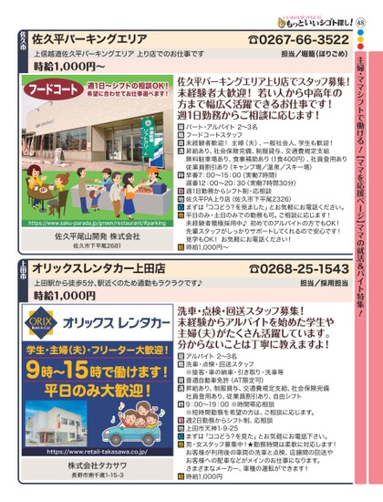 ●●●48主婦・ママシフトで働ける!【ママを応援ページ】ママの就活&バイト特集!☎0267-66-3522担当/堀籠(ほりごめ)佐久平パーキングエリア上信越道佐久平パーキングエリア上り店でのお仕事です時給1,000円〜佐久市フードコート週1日〜シフトの相談OK!希望に合わせてお仕事選べます!https://www.saku-parada.jp/green/restaurant/#parking佐久平尾山開発株式会社佐久市下平尾2681佐久平パーキングエリア上り店でスタッフ募集!未経験者大歓迎!若い人から中高年の方まで幅広く活躍できるお仕事です!週1日勤務からご相談に応じます!パート・アルバイト2〜3名フードコートスタッフ未経験者歓迎!主婦(夫)、一般社会人、学生も歓迎!昇給あり、社会保険完備、制服貸与、交通費規定支給無料駐車場あり、食事補助あり(1食400円)、社員登用あり従業員割引あり(キャンプ場/温泉/スキー場)早番7:00〜15:00(実働7時間)遅番12:00〜20:30(実働7時間30分)週1日勤務からシフト制・応相談佐久平PA上り店(佐久市下平尾2326)まずは「ココどう?を見ました」とお気軽にお電話ください。平日のみ・土日のみでの勤務も可。ご相談に応じます!未経験者積極採用中♪初めてのアルバイトの方でもOK!先輩スタッフがしっかりサポートしてくれるので安心です!見学もOK!お気軽にお電話ください!時給1,000円〜☎0268-25-1543担当/採用担当オリックスレンタカー上田店上田駅から徒歩5分、駅近くのため通勤もラクラクです♪時給1,000円上田市915学生・主婦(夫)・フリーター大歓迎!時で働けます!時〜平日のみ大歓迎!https://www.retail-takasawa.co.jp/株式会社タカサワ長野市南千歳1-15-3洗車・点検・回送スタッフ募集!未経験からアルバイトを始めた学生や主婦(夫)がたくさん活躍しています。分からないことは丁寧に教えますよ!アルバイト2〜3名洗車・点検・回送スタッフ※接客・車の納車・引き取り・洗車等普通自動車免許(AT限定可)昇給あり、制服貸与、交通費規定支給、社会保険完備社員登用あり、従業員割引あり、自由シフト9:00〜19:00※時間帯応相談※短時間勤務を希望の方は、ご相談に応じます。週2日勤務からシフト制、応相談上田市天神1-9-25まずは「ココどう?を見た」とお気軽にお電話下さい。男・女スタッフ募集中!★勤務時間は柔軟に対応します!お客様が利用後の車両の洗車と点検、店舗間の回送やお客様への配車などがメインのお仕事になります。さまざまなメーカー、車種の運転ができます!時給1,000円