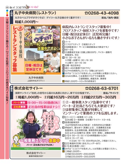 丸子中央病院(レストラン)丸子のベルプラザがすぐそば!デイツー丸子店様のすぐ裏手です!時給1,000円〜☎0268-43-4098担当/池内・須田病院内レストランでスタッフ募集中!フロアスタッフ・厨房スタッフを募集中です♪日曜・祝日は定休日!託児所完備!小さなお子さんがいる方も働きやすいです♪パート①フロアスタッフ②厨房スタッフ未経験者OK!サービス業経験者は大歓迎です♪各1〜2名交通費規定支給(日額上限830円)、マイカー通勤可制服貸与、労災10:30〜16:30※月曜〜金曜10:30〜16:30※土曜11:30〜16:00日曜・祝日定休日週3〜4日の勤務でOKです♪丸子中央病院内レストラン(9階にあります)まずは「ココどう?を見ました」とお気軽にお電話ください。主なお仕事は、①お客様のフロアでの接客等②調理補助、食器洗浄、清掃等時給1,000円〜※3ヶ月の研修あり20代〜代が40活躍中ですよ♪日曜・祝日は定休日ですhttps://maruko-hp.jp/丸子中央病院上田市中丸子1771-1レストランスタッフ募集49ねっ!ココどう?上田市●●●主婦・ママシフトで働ける!【ママを応援ページ】ママの就活&バイト特集!浅間サンライン「別府」の信号から湯の丸高原に向かい、車で10分程度です。①時給1,000円〜②月給16万円〜20万円③月給22万円〜30万円担当/サイトウ①②一般事務スタッフ急募中です!パート・正社員どちらでも大歓迎です♪③は収集車に先輩が同乗してマンツーマンで業務のコツを伝授します。【パート】①一般事務※1〜2名【正社員】②一般事務③収集ドライバー※3〜4名普通自動車免許③は中型免許のある方歓迎!大型免許ある方優遇!昇給あり、賞与あり(実績による)、交通費規定支給制服貸与、社会保険完備、資格取得支援制度あり【正】はさらに各種手当(家族・住宅・資格)、退職金制度【パ】9:00〜15:00※1日4時間勤務からOK!【正】8:15〜17:00※③は6:15〜15:00の早出もOK。ご相談ください。【正】隔週休2日制(会社カレンダーあり)【パ】週3日勤務〜OK!まずは「ココどう?を見ました」とお気軽にお電話ください。①時給1,000円〜②月給160,000円〜200,000円③月給220,000円〜300,000円伝票入力がメインの仕事です♪一般事務スタッフ急募中パート・正社員どちらでもOK♪https://53-no-saito.com/株式会社サイトー東御市新張2087パート事務正社員事務9:00〜15:00勤務OK!正社員の残業ほぼナシ!☎0268-63-6701株式会社サイトー東御市
