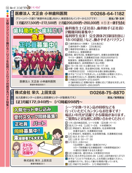 担当/原・玉井グリーンパーク通り「東御中央公園」向かい、東部湯の丸インターからスグです!①月給227,500円〜272,500円②月給200,000円〜260,000円※①②一律手当含む歯科衛生士(正社員)、歯科助手(正社員)2職種同時募集中♪福利厚生充実!完全週休2日制(振替出勤なし)18:00退社♪など、働きやすさバツグン!歯科衛生士・歯科助手急募正社員募集中!☎0268-64-1182医療法人文正会小林歯科医院東御市●●●51ねっ!ココどう?主婦・ママシフトで働ける!【ママを応援ページ】ママの就活&バイト特集佐久市・上田市!一緒に楽しく!働きましょう!https://kobayashi-dental.com/医療法人文正会小林歯科医院東御市常田898-1①歯科衛生士<急募>[正社員2名]②歯科助手<急募>[正社員2名]①専修学校卒業以上、歯科衛生士②高卒以上、経験者歓迎昇給、賞与年2回、各種諸手当あり、各種社会保険完備マイカー通勤可、交通費規定支給(月20,000円まで)制服貸与、退職金制度あり、育児休業、介護休業看護休暇あり、試用期間あり(6ヶ月間)8:15〜18:00※土曜のみ8:15〜17:30木曜・日曜・祝日、完全週休2日制、年末年始、お盆※年間休日122日※祝日がある週に振替出勤無しまずは「ココどう?を見ました」とお気軽にお電話ください。②は選考方法として、面接時に筆記試験を行います。①月給227,500円〜272,500円※[歯科衛生士]前職の給与・経験に応じて賃金を決定します。②月給200,000円〜260,000円株式会社栄久上田支店佐久医療センターと信州上田医療センターが勤務先です♪[正]月給172,940円〜[パ]時給998円〜☎0268-75-8870担当/採用担当入院セット申し込み受付スタッフ同時募集!正社員同時募集中!未経験者でも大丈夫パートミドルシニア活躍中♪株式会社栄久上田支店東御市鞍掛22-1シーツ交換・リネン品の回収などを行っていただくカンタンなお仕事です♪幅広い年代が活躍できる環境があります。ご質問などお気軽にお問い合わせください!リネン品の納品回収、シーツ交換(正社員・パート)[佐久]3〜4名[上田]1〜2名※未経験OK[正]昇給あり、賞与あり、制服貸与、社会保険完備扶養手当あり、交通費規定支給[パ]昇給あり、制服貸与、社会保険完備、交通費規定支給[正]佐久8:00〜17:00[正]上田8:30〜17:30[パ]佐久・上田ともに1日2時間〜、週2日〜勤務OKです♪※5〜7時間働ける方積極採用!※時間帯相談OK!※週5日で勤務できる方大歓迎![正]日曜の他、週1日休み※年間休日105日[佐久]佐久市中込3400-28[上田]上田市緑が丘1-27-21まずは「ココどう?を見ました」とお気軽にお電話ください。未経験の方でも、安心して働ける環境が整っています。[正]月給172,940円〜[パ]時給998円〜