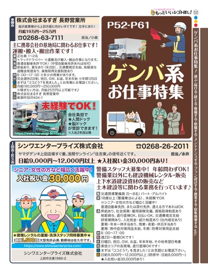 52●●●ゲンバ系お仕事特集!運ぶ・届ける・建てる・警備する・整備する・メンテナンスする・プラン設計する・農業する・収集廃棄するetc.P52-P61ゲンバ系お仕事特集株式会社まるすぎ長野営業所塩沢産業様から上田方面に向かいすぐです!左手にあり!月給19万円〜25万円東御市☎0268-63-7111担当/小森主に携帯会社の基地局に関わるお仕事です!運搬・搬入・搬出作業です!正社員1〜2名トラックドライバー※運搬及び搬入・搬出作業になります。普通自動車免許でOK!(中型自動車免許あれば尚可)昇給あり、賞与あり(年2回)、交通費規定支給、制服貸与退職金制度あり、資格取得支援制度あり8:00〜17:00※多少の残業があります。完全週休2日制、祝日、GW、お盆、年末年始※年間125日まずは「ココどう?を見ました」とお気軽にお電話ください。月給190,000円〜250,000円※稼ぎたい方は、月給25万円以上可能です♪株式会社まるすぎ長野営業所東御市加沢404-1未経験でOK!会社負担で★人間ドック★脳ドックが受診できます!※入社2年目以降https://www.marusugi-9111.co.jpシンワエンタープライズ株式会社☎0268-26-2011ヤマダデンキ上田店様すぐ裏、浅間サンライン「住吉東」の信号近くです。日給9,000円〜12,000円以上★入社祝い金30,000円あり!担当/永井シニア・女性の方など幅広く活躍中!入社祝い金30,000円警備スタッフ大募集中!年齢問わずOK!警備業以外にも建設機械レンタル・販売上下水道建設資材の販売など土木建設等に関わる業務を行っています♪交通誘導警備員(5〜8名)パート・アルバイト18歳以上(警備業法による)、未経験でOK※シニア・女性の方など幅広く活躍中!普通自動車免許、または原付免許、通える方であればOK昇給あり、社会保険・雇用保険完備、資格取得制度あり制服貸与、直行直帰OK、日払いOK、交通費規定支給研修期間あり、入社祝金・紹介制度あり(社内規定あり)夏期・年末一時手当あり、残業・夜勤・休日手当あり夏期:熱中症対策用品支給、冬期:防寒対策用品支給8:00〜17:00週2日〜勤務OKです!日曜日、祝日、GW、お盆、年末年始、その他希望日考慮東信エリアの各現場、直行直帰OKです!まずは「ココどう?」を見ました!とお気軽にお電話下さい。日給9,000円〜12,000円以上(研修中:日給8,000円〜)★入社祝い金30,000円あり!★建機レンタルの運搬・洗浄スタッフ同時募集中★【】大型免許必須、勤務地は佐久市です。時給1,500円https://www.shinwaenterprise.com/シンワエンタープライズ株式会社上田市古里1989-2上田市・佐久市