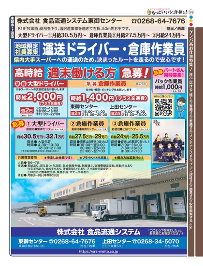 54●●●ゲンバ系お仕事特集!運ぶ・届ける・建てる・警備する・整備する・メンテナンスする・プラン設計する・農業する・収集廃棄するetc.急募パック作業員時給円1,000担当/西澤HPもご覧ください株式会社食品流通システム東御センター☎0268-64-7676担当/西澤R18「牧家西」信号を下り、塩沢産業様を過ぎて右折、50m先右手です。大型ドライバー①月給30.5万円〜倉庫作業員②月給27.5万円〜③月給24万円〜地域限定社員募集県内大手スーパーへの運送のため、決まったルートを走るので安心です!パートさん同時募集!運送ドライバー・倉庫作業員週末働ける方急募!高時給東御市・上田市急募大型ドライバー大手スーパーへの食品配送をお願いします時給2,000円(プラス交通費)週2日担当/西澤①3:00〜10:00②9:00〜16:00③15:00〜22:00急募①大型ドライバー勤務地●東御センター担当/西澤急募倉庫作業員仕分け・梱包・ピッキングをお願いします担当/水本時給1,400円(プラス交通費)東御センター週2日②倉庫作業員①5:00〜11:00②14:00〜20:00上田センター週2日③倉庫作業員①6:00〜10:00②14:00〜18:00勤務地●東御センター担当/西澤勤務地●上田センター担当/水本月給30.5万円〜32.1万円月給27.5万円〜29万円月給24万円〜25.5万円資格●時間●大型免許4:30〜13:3012:30〜21:30※その他の時間帯もあります。ご相談ください!資格●時間●資格は必要ありません!18:00〜翌3:0020:00〜翌5:0022:00〜翌7:00資格●時間●資格は必要ありません!7:00〜16:007:30〜16:308:30〜17:30共通募集要項人数●待遇●★安定した仕事です!★プライベートも充実!★働き方改革実行中!各6〜7名昇給あり、賞与あり(年2回)、社会保険完備、制服貸与、交通費規定支給、皆勤手当あり住宅手当あり、家族手当あり、研修期間3ヶ月あり、正社員登用制度あり①はさらに無事故手当、乗務手当、マナー手当あり月8日〜9日(年間105日)休日●東御センター東御市加沢138-26株式会社食品流通システム「ココどう?を見ました」とお気軽にお電話ください!☎0268-64-7676上田センター☎0268-34-5070担当/水本担当/西澤https://srs-meito.co.jp上田市大屋630