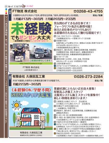 大屋駅から丸子に向かい「石井」信号を左折後、坂井」信号を右折し5分程度。①月給21万円〜30万円②月給20万円〜23万円☎0268-43-4755担当/佐藤未経験でもゼンゼン大丈夫〜試用期間6ヶ月あり(しっかり学べます)〜FT物流株式会社上田市ねっ!ココどう?男女問わずできるお仕事です♪フォークリフト免許も取得可能!休日とお仕事のメリハリもあり!未経験の方も安心して働ける環境です!①4t・10tドライバー(正社員)②設備輸送及びルート営業スタッフ(正社員)未経験でOK!仕事内容により必要なスキル・資格は入社後に取得できます!まずはお問い合わせください!※普通自動車免許は必要です。昇給あり、賞与年2回、各種社会保険完備、制服貸与交通費規定支給、家族手当あり、退職金制度あり残業代別途支給、各種資格取得支援制度あり8:10〜17:00週休2日制(土日祝)、GW、お盆、年末年始当社カレンダーによる※年間休日112日上田市長瀬1603-1まずは「ココどう?を見ました」とお気軽にお電話ください。①月給210,000円〜300,000円②月給200,000円〜230,000円☎026-273-2284担当/関有限会社久保田瓦工業R18「刈屋原」の信号から笄橋を渡り車で1分程度です。月給22万円〜30万円千曲市《未経験OK/学歴不問》NEWスタッフ大募集有限会社久保田瓦工業坂城町大字上五明761-3(本社)業績好調にともない正社員大募集!屋根瓦ふき施工スタッフ太陽光システム施工スタッフを募集中!新しい仲間を求めています♪①屋根瓦ふき施工スタッフ正社員2名②太陽光システム施工スタッフ正社員2名59歳以下(定年60歳のため)◇未経験OK/学歴不問◇昇給あり、賞与あり、社会保険完備、交通費規定支給退職金共済加入8:00〜18:00(休憩時間2時間)日・祝日・他(週休2日制)年末年始・GW・お盆休暇あり※当社勤務カレンダーによる※土曜日は隔週休み千曲市大字力石字東沖899-1(事業所)まずは「ココどう?を見ました」とお気軽にお電話ください。応募理由は、ものづくり/瓦などの日本文化が好きでOK♪瓦・屋根工事スタッフの技術や不明点は経験豊富な先輩が丁寧に教えます。見学だけでも一度お越しください!月給220,000円〜300,000円※試用期間3ヶ月あり(日給8,500円〜※経験等を考慮します)ご応募お待ちしてます!http://www.ft-butsuryu.co.jp/FT物流株式会社上田市長瀬1603-157●●●ゲンバ系お仕事特集!運ぶ・届ける・建てる・警備する・整備する・メンテナンスする・プラン設計する・農業する・収集廃棄するetc.