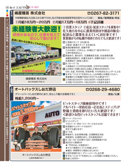 中部横断道佐久臼田I.Cから車で10分。佐久平総合技術高等学校臼田キャンパス前!①月給18万円〜20万円②月給17万円〜18万円※下記詳細☎0267-82-3171担当/採用担当・井出未経験者大歓迎!農業に携わる仕事をしてみませんか?研修があるので、仕事を覚えて安心して働けます!嶋屋種苗株式会社佐久市ねっ!ココどう?①営業スタッフ②配送・配達スタッフを募集中!佐久地方を中心に農業用資材や種苗の販売・配達など農業を支えていくお仕事です!異業種からの転職や初めての方でも大歓迎です!①営業スタッフ正社員1名②配送・配達スタッフ正社員2名普通自動車免許、経験不問①のみ短大・大卒以上、40歳以下(省令3号のイ)②準中型免許以上昇給あり、賞与あり、交通費規定支給、社会保険完備退職金制度あり、扶養手当あり、役職手当あり(①のみ)社員寮あり(家族入居可)8:15〜17:15※残業あり(①月平均20時間、②月平均10時間)土日祝日(日曜と祝日に出勤した場合は代休あり)GW、お盆、年末年始、有給休暇、その他会社カレンダーによるまずは「ココどう?を見ました」とお気軽にお電話ください。異業種からの転職や初めての方でも大歓迎です!①月給180,000円〜200,000円※別途手当あり②月給170,000円〜180,000円※別途手当あり☎0268-29-4680担当/土屋オートバックスしおだ野店グリーンパークしおだ野内にあり、安心して働ける環境です♪時給1,200円〜上田市ッフ00タ,2ス1ト給ッピ時〜円★週3日から勤務OK!★★フリーター大歓迎!「平日のみ」も相談OK!https://recruit.wadasho.co.jp/オートバックスしおだ野店上田市神畑518-1ピットスタッフ積極採用中です!アルバイト→契約社員→正社員とステップUP整備士資格を取りたい方大歓迎です♪<歓迎>女性ピットスタッフも活躍できます!パート・アルバイトピットスタッフ※Wワーク・学生・フリーターどなたもOK未経験からスタートできます!学生でも働けます!3〜4名昇給あり、社会保険完備、交通費規定支給制服貸与、社員割引あり、正社員登用あり9:45〜19:10の間で1日6〜8時間勤務でOK週3日から勤務OK★「平日のみ」も相談OK!★テスト期間のシフトも考慮します!★曜日・時間帯のご相談に応じます♪上田市神畑518-1グリーンパークしおだ野まずは「ココどう?を見ました」とお気軽にお電話ください。時給1,200円〜たちと一私緒に、安心して働けます!社員寮あり(家族入居可)http://www.shimaya-seed.co.jp/嶋屋種苗株式会社佐久市臼田1706-359●●●ゲンバ系お仕事特集!運ぶ・届ける・建てる・警備する・整備する・メンテナンスする・プラン設計する・農業する・収集廃棄するetc.