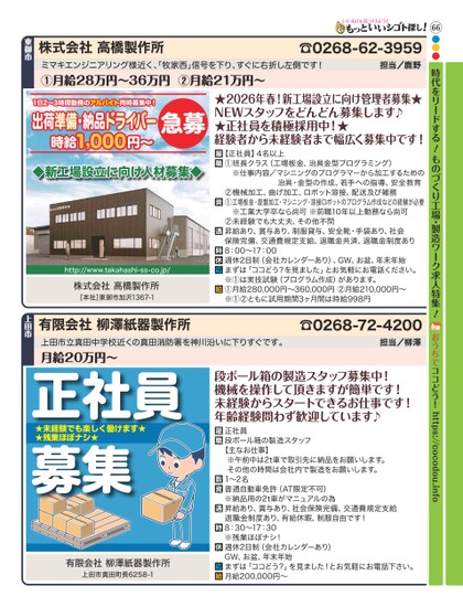 66●●●時代をリードする!ものづくり工場・製造ワーク求人特集!おうちでココどう!https://cocodou.info☎0268-62-3959担当/鹿野ミマキエンジニアリング様近く、牧家西」信号を下り、すぐに右折し左側です!①月給28万円〜36万円②月給21万円〜株式会社高橋製作所東御市1日2〜3時間勤務のアルバイト同時募集中!出荷準備・納品ドライバー急募1,000円〜時給◆新工場設立に向け人材募集◆http://www.takahashi-ss-co.jp/株式会社高橋製作所[本社]東御市加沢1367-1★2026年春!新工場設立に向け管理者募集★NEWスタッフをどんどん募集します♪★正社員を積極採用中!★経験者から未経験者まで幅広く募集中です!【正社員】4名以上①班長クラス(工場板金、治具金型プログラミング)※仕事内容/マシニングのプログラマーから加工するための治具・金型の作成、若手への指導、安全教育②機械加工、曲げ加工、ロボット溶接、配送及び雑務①工場板金・旋盤加工・マシニング・溶接ロボットのプログラム作成などの経験が必要※工業大学卒なら尚可※前職10年以上勤務なら尚可②未経験でも大丈夫、その他不問昇給あり、賞与あり、制服貸与、安全靴・手袋あり、社会保険完備、交通費規定支給、退職金共済、退職金制度あり8:00〜17:00週休2日制(会社カレンダーあり)、GW、お盆、年末年始まずは「ココどう?を見ました」とお気軽にお電話ください。※①は実技試験(プログラム作成)があります。①月給280,000円〜360,000円②月給210,000円〜※①②ともに試用期間3ヶ月間は時給998円☎0268-72-4200担当/柳澤上田市立真田中学校近くの真田消防署を神川沿いに下りすぐです。月給20万円〜有限会社柳澤紙器製作所上田市★未経験でも楽しく働けます★★残業ほぼナシ★正社員募集有限会社柳澤紙器製作所上田市真田町長6258-1段ボール箱の製造スタッフ募集中!機械を操作して頂きますが簡単です!未経験からスタートできるお仕事です!年齢経験問わず歓迎しています♪正社員段ボール箱の製造スタッフ【主なお仕事】※午前中は2t車で取引先に納品をお願いします。その他の時間は会社内で製造をお願いします。1〜2名普通自動車免許(AT限定不可)※納品用の2t車がマニュアルの為昇給あり、賞与あり、社会保険完備、交通費規定支給退職金制度あり、有給休暇、制服自由です!8:30〜17:30※残業ほぼナシ!週休2日制(会社カレンダーあり)GW、お盆、年末年始まずは「ココどう?」を見ました!とお気軽にお電話下さい。月給200,000円〜