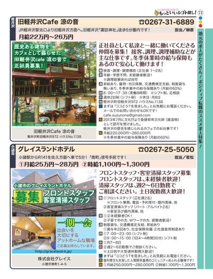 ●●●72地元の求人がたくさん!ポジティブ転職のススメ求人特集!☎0267-31-6889担当/原JR軽井沢駅北口より旧軽井沢方面へ。旧軽井沢「諏訪神社」徒歩5分圏内です!月給22万円〜26万円旧軽井沢Cafe涼の音軽井沢歴史ある建物をカフェとして蘇らせた旧軽井沢cafe涼の音で正社員募集!https://suzunone.main.jp/旧軽井沢Cafe涼の音軽井沢町旧軽井沢972ハウスNo.1138正社員として私達と一緒に働いてくださる仲間を募集!接客、調理、調理補助などが主な仕事です。冬季休業時の給与保障もあるので安心して働けます!接客・調理・調理補助(正社員1〜2名)年齢・学歴不問、未経験者歓迎!※調理経験あれば尚可昇給あり、雇用・労災保険、交通費規定支給、制服貸与賄いあり、冬季休業中の給与保障あり(月給の60%)8:00〜17:30(実働8時間)※シフト制、応相談週休2日制(シフト制)※休日:月8日軽井沢町旧軽井沢972ハウスNo.1138まずは「ココどう?を見ました」とお気軽にお電話ください。メールでのお問い合わせもOKです!cafe.suzunone@gmail.com2013年7月に文化庁より登録有形文化財(建造物)として認可を受けました。軽井沢の歴史を感じられるカフェでのお仕事です!月給220,000円〜260,000円※冬季休業中の給与保障あり(月給の60%)☎0267-25-5050担当/若松小諸駅からR141を佐久方面へ車で5分!「南町」信号手前です!①月給25万円〜28万円②時給1,100円〜1,300円グレイスランドホテル小諸市小諸市のグレイスランドホテル募集フロントスタッフ客室清掃スタッフ一期一会出会いを大切にするアットホームな職場ご応募お待ちしています。http://graceland-k.jp/株式会社グレイス小諸市南町1-4-5フロントスタッフ・客室清掃スタッフ募集フロントスタッフは、未経験者歓迎!清掃スタッフは、週2〜6日勤務でご相談ください。土日祝勤務大歓迎!①フロントスタッフ(正社員2名)※フロント業務、電話・予約受付・館内清掃、他②客室清掃スタッフ(パート・アルバイト2名)※客室及び館内清掃、他①②未経験者OK!②子育て中の方、Wワークの方、経験者歓迎!制服貸与、交通費規定支給、昇給あり①賞与年2回あり、社会保険完備②社員登用制度あり①7:00〜23:00(シフト制)②9:00〜15:00(1日4〜4時間30分)シフト制①月7〜8日②週2〜6日勤務でご相談ください。※土日祝や大型連休勤務大歓迎!まずは「ココどう?を見ました」とお気軽にお電話ください。福利厚生も充実した人間関係重視のコミュニティあふれる職場です!①月給250,000円〜280,000円②時給1,100円〜1,300円