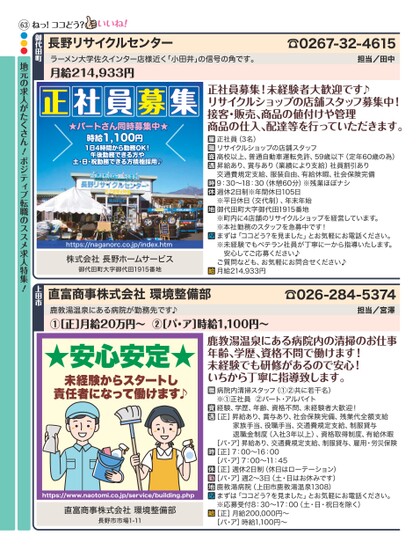 長野リサイクルセンターラーメン大学佐久インター店様近く「小田井」の信号の角です。月給214,933円☎0267-32-4615担当/田中正社員募集★パートさん同時募集中★時給1,100円1日4時間から勤務OK!午後勤務できる方や土・日・祝勤務できる方積極採用♪https://naganorc.co.jp/index.htm株式会社長野ホームサービス御代田町大字御代田1915番地正社員募集!未経験者大歓迎です♪リサイクルショップの店舗スタッフ募集中!接客・販売、商品の値付けや管理商品の仕入、配達等を行っていただきます。正社員(3名)リサイクルショップの店舗スタッフ高校以上、普通自動車運転免許、59歳以下(定年60歳の為)昇給あり、賞与あり(業績により支給)社員割引あり交通費規定支給、服装自由、有給休暇、社会保険完備9:30〜18:30(休憩60分)※残業ほぼナシ週休2日制※年間休日105日※平日休日(交代制)、年末年始御代田町大字御代田1915番地※町内に4店舗のリサイクルショップを経営しています。※本社勤務のスタッフを急募中です!まずは「ココどう?を見ました」とお気軽にお電話ください。※未経験でもベテラン社員が丁寧に一から指導いたします。安心してご応募ください♪ご質問なども、お気軽にお問合せください♪月給214,933円地元の求人がたくさん!ポジティブ転職のススメ求人特集63ねっ!ココどう?御代田町●●●★安心安定★未経験からスタートし責任者になって働けます♪https://www.naotomi.co.jp/service/building.php直富商事株式会社環境整備部長野市市場1-11鹿教湯温泉にある病院内の清掃のお仕事年齢、学歴、資格不問で働けます!未経験でも研修があるので安心!いちから丁寧に指導致します。病院内清掃スタッフ(①②共に若干名)※①正社員②パート・アルバイト経験、学歴、年齢、資格不問、未経験者大歓迎![正]昇給あり、賞与あり、社会保険完備、残業代全額支給家族手当、役職手当、交通費規定支給、制服貸与退職金制度(入社3年以上)、資格取得制度、有給休暇[パ・ア]昇給あり、交通費規定支給、制服貸与、雇用・労災保険[正]7:00〜16:00[パ・ア]7:00〜11:45[正]週休2日制(休日はローテーション)[パ・ア]週2〜3日(土・日はお休みです)鹿教湯病院(上田市鹿教湯温泉1308)まずは「ココどう?を見ました」とお気軽にお電話ください。※応募受付8:30〜17:00(土・日・祝日を除く)[正]月給200,000円〜[パ・ア]時給1,100円〜☎026-284-5374担当/宮澤直富商事株式会社環境整備部鹿教湯温泉にある病院が勤務先です♪①[正]月給20万円〜②[パ・ア]時給1,100円〜上田市!