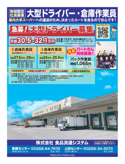 地域限定社員募集県内大手スーパーへの運送のため、決まったルートを走るので安心です!大型ドライバー・倉庫作業員大型ドライバー募集HPもご覧ください急募!月給30.5〜32.1万円資格●時間●大型免許勤務地●東御センター4:30〜13:30・12:30〜21:30※その他の時間帯もあります。ご相談ください!担当/新村②倉庫作業員勤務地●東御センター担当/新村③倉庫作業員勤務地●上田センター担当/西澤月給27.5万円〜29万円資格●時間●資格は必要ありません!18:00〜翌3:0020:00〜翌5:0022:00〜翌7:00月給24万円〜25.5万円資格●時間●資格は必要ありません!7:00〜16:007:30〜16:308:30〜17:30パートさん同時募集!急募パック作業員時給円1,065担当/新村共通募集要項人数●待遇●★安定した仕事です!★プライベートも充実!★働き方改革実行中!各6〜7名昇給あり、賞与あり(年2回)、社会保険完備、制服貸与、交通費規定支給、皆勤手当あり住宅手当あり、家族手当あり、研修期間3ヶ月あり、正社員登用制度あり①はさらに無事故手当、乗務手当、マナー手当あり月8日〜9日(年間105日)休日●株式会社食品流通システム「ココどう?を見ました」とお気軽にお電話ください!東御センター東御市加沢138-26☎0268-64-7676上田センター☎0268-34-5070担当/西澤担当/新村https://srs-meito.co.jp上田市大屋630