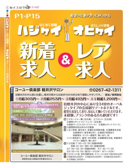 新着求人&レア求人コーユー倶楽部軽井沢サロン☎0267-42-1311担当/採用担当旧軽井沢の中心部に位置し、軽井沢駅からは徒歩15分の好立地で通勤しやすいです。①月給30万円〜②月給25万円〜③月給40万円〜④⑤時給1,200円〜はじめて掲載!お久しぶり掲載特集!軽井沢はじめて掲載お久しぶり登場希望の仕事がきっとみつかるねっ!ココどう?P1-P151●●●〇会員制ホテルの為、お客様の大半が日本国内の方です。安心して働いていただけます。〇未経験OK!ブランクOKです!〇40代・50代・60代のミドル・シニア世代歓迎!〇調理スタッフ(スーシェフ)月給40万円スタート!http://www.japantotalclub.co.jp/facilities/karuizawasalonコーユー倶楽部軽井沢サロン長野県北佐久郡軽井沢町軽井沢2-3旧軽井沢の中心にあり全34室のオーベルジュタイプの会員制リゾートホテルです。経営も安定しており、安心して働いていただけます。未経験、ブランクのある方も歓迎です!①マネージャー職(正社員)②フロント(正社員)③調理スタッフ(スーシェフ)(正社員)④朝食サービススタッフ(パート)⑤清掃スタッフ(パート)③調理師免許お持ちの方優遇<正>昇給・賞与あり、各種社会保険完備、交通費規定支給社員寮あり(単身者のみ)、社員紹介制度あり制服貸与、マイカー通勤可、賄いあり、他<パ>昇給あり、雇用・労災保険、交通費規定支給、制服貸与マイカー通勤可、賄いあり①②日勤7:00〜22:00(実働8時間)夜勤22:00〜翌8:00(実働8時間)③7:00〜22:00(実働8時間)④7:30〜11:00⑤9:00〜15:00・週2日〜でもOK!WワークOK!①②③シフト制、変形労働制採用、オフシーズンは月12回の休みもあり①月給300,000円〜②月給250,000円〜③月給400,000円〜④⑤時給1,200円〜