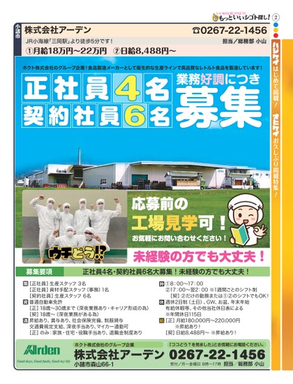 2●●●はじめて掲載!お久しぶり掲載特集!☎0267-22-1456担当/総務部小山株式会社アーデンJR小海線「三岡駅」より徒歩5分です!①月給18万円〜22万円②日給8,488円〜小諸市業務好調につき募集名名46正社員契約社員ホクト株式会社のグループ企業食品製造メーカーとして衛生的な生産ラインで高品質なレトルト食品を製造しています!応募前の工場見学可!未経験の方でも大丈夫!お気軽にお問い合わせください!正社員4名・契約社員6名大募集!未経験の方でも大丈夫!募集要項[正社員]生産スタッフ3名[正社員]資材手配スタッフ(事務)1名[契約社員]生産スタッフ6名普通自動車免許[正]18歳〜30歳まで(深夜業務あり・キャリア形成の為)[契]18歳〜(深夜業務がある為)昇給あり、賞与あり、社会保険完備、制服貸与交通費規定支給、深夜手当あり、マイカー通勤可[正]のみ:家族・住宅・役職手当あり、退職金制度あり①8:00〜17:00②17:00〜翌2:00※1週間ごとのシフト制[契]②だけの勤務または①②のシフトでもOK!週休2日制(土日)、GW、お盆、年末年始有給休暇等、その他当社休日表による※年間休日115日[正]月給180,000円〜220,000円※昇給あり![契]日給8,488円〜※昇給あり!ホクト株式会社のグループ企業株式会社アーデン0267-22-1456「ココどう?を見ました」とお気軽にお電話ください。受付/月〜金曜日8時〜17時担当/総務部小山小諸市森山66-1