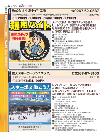 ツルヤ野沢店様近く、ファミリーマート佐久取出町店様からすぐです①1,200円〜1,300円②時給1,100円〜1,200円☎0267-62-0537担当/中島期短★9月〜12月★3月〜4月バイト事務スタッフ同時募集!株式会社中島タイヤ工場佐久市ねっ!ココどう?9●●●はじめて掲載!お久しぶり掲載特集!タイヤ交換!繁忙期スタッフ急募!ピットスタッフ、事務スタッフ同時募集!短期募集ですが、長期勤務も相談OK!お気軽にお問合せ下さい♪パート・アルバイト①ピットスタッフ②事務スタッフ未経験者OK!★経験者は積極採用!シニア世代もOK!昇給あり、各種社会保険完備、制服貸与試用期間あり、交通費規定支給①9:00〜17:30②9:00〜15:00★午前中のみ、午後から出勤などもOK!週休2日制★勤務日数はご相談下さい♪★繁忙期の為たくさん働ける方歓迎です!まずは「ココどう?を見ました」とお気軽にお電話ください。①時給1,200円〜1,300円②時給1,100円〜1,200円WorksaTierakajimNhttps://www.nakajima-tire.com/株式会社中島タイヤ工場佐久市大字取出町458-2☎0267-67-8100担当/土屋佐久スキーガーデン「パラダ」佐久平クリーンセンター様すぐ隣です!①②③④⑤時給1,100円〜佐久市スキー場で働こう!フードコートリフト監視レンタルチケットカウンターキッズランド未経験歓迎♪短期OK♪友達同士OK♪https://www.saku-parada.jp/佐久平尾山開発株式会社佐久市下平尾2681「パラダ」スキー場スタッフ大募集!未経験でも安心のスタート♪先輩スタッフがしっかりサポートします!未経験歓迎♪短期OK♪友達同士の応募OK♪パート・アルバイト(大募集!)①フードコートスタッフ②チケットカウンタースタッフ③レンタルスタッフ④リフト監視業務スタッフ⑤キッズランド監視業務スタッフ未経験者歓迎、経験者優遇!交通費規定支給、食事、リフトなど従業員割引あり8:00〜17:00※シフト制、応相談週休2日※出勤日時はご相談に応じます!★年末年始、土日のみ、平日のみなどの短期勤務もOK★佐久スキーガーデン「パラダ」(佐久市上平尾2066-1)学生・Wワーク・主婦(夫)・シニアも大歓迎降雪の少ない地域なので通勤も安心!①②③④⑤時給1,100円〜<月収例>時給1,100円・1日8時間勤務:月収18万円以上
