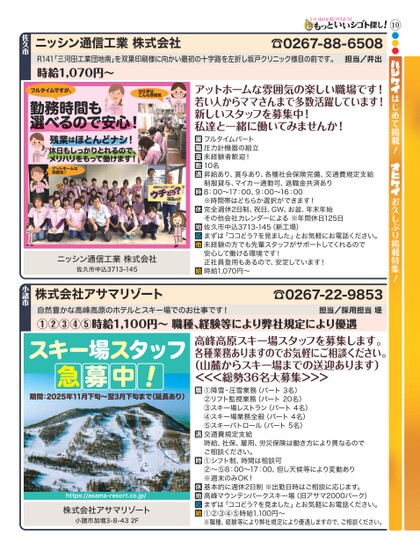 10●●●はじめて掲載!お久しぶり掲載特集!R141「三河田工業団地南」を双葉印刷様に向かい最初の十字路を左折し坂戸クリニック様目の前です。時給1,070円〜担当/井出お仕事はこんな雰囲気フルタイムですが、勤務時間も選べるので安心!残業はほとんどナシ!休日もしっかりとれるので、メリハリをもって働けます!アットホームな雰囲気!ニッシン通信工業株式会社佐久市中込3713-145アットホームな雰囲気の楽しい職場です!若い人からママさんまで多数活躍しています!新しいスタッフを募集中!私達と一緒に働いてみませんか!フルタイムパート圧力計機器の組立未経験者歓迎!10名昇給あり、賞与あり、各種社会保険完備、交通費規定支給制服貸与、マイカー通勤可、退職金共済あり8:00〜17:00、9:00〜16:00※時間帯はどちらか選択ができます!完全週休2日制、祝日、GW、お盆、年末年始その他会社カレンダーによる※年間休日125日佐久市中込3713-145(新工場)まずは「ココどう?を見ました」とお気軽にお電話ください。未経験の方でも先輩スタッフがサポートしてくれるので安心して働ける環境です!正社員登用もあるので、安定しています!時給1,070円〜☎0267-88-6508ニッシン通信工業株式会社佐久市自然豊かな高峰高原のホテルとスキー場でのお仕事です!①②③④⑤時給1,100円〜職種、経験等により弊社規定により優遇担当/採用担当堤スキー場スタッフ急募中!期間:2025年11月下旬〜翌3月下旬まで(延長あり)https://asama-resort.co.jp/株式会社アサマリゾート小諸市加増3-8-432F高峰高原スキー場スタッフを募集します。各種業務ありますのでお気軽にご相談ください。(山麓からスキー場までの送迎あります)<<<総勢36名大募集>>>①降雪・圧雪業務(パート3名)②リフト監視業務(パート20名)③スキー場レストラン(パート4名)④スキー場業務全般(パート4名)⑤スキーパトロール(パート5名)交通費規定支給時給、社保、雇用、労災保険は働き方により異なるのでご相談ください。①シフト制、時間は相談可②〜⑤8:00〜17:00、但し天候等により変動あり※週末のみOK!基本的に週休2日制※出勤日時はご相談に応じます。高峰マウンテンパークスキー場(旧アサマ2000パーク)まずは「ココどう?を見ました」とお気軽にお電話ください。①②③④⑤時給1,100円〜※職種、経験等により弊社規定により優遇しますので、ご相談ください。☎0267-22-9853株式会社アサマリゾート小諸市