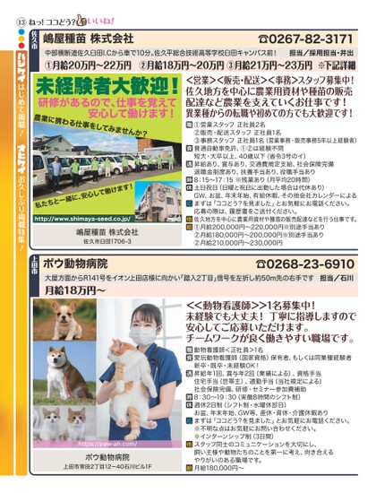 ☎0267-82-3171担当/採用担当・井出中部横断道佐久臼田I.Cから車で10分。佐久平総合技術高等学校臼田キャンパス前!①月給20万円〜22万円②月給18万円〜20万円③月給21万円〜23万円※下記詳細<営業><販売・配送><事務>スタッフ募集中!佐久地方を中心に農業用資材や種苗の販売配達など農業を支えていくお仕事です!異業種からの転職や初めての方でも大歓迎です!未経験者大歓迎!農業に携わる仕事をしてみませんか?研修があるので、仕事を覚えて安心して働けます!嶋屋種苗株式会社佐久市ねっ!ココどう?13●●●はじめて掲載!お久しぶり掲載特集!①営業スタッフ正社員2名②販売・配送スタッフ正社員1名③事務スタッフ正社員1名(営業事務・販売事務5年以上経験者)普通自動車免許、①②は経験不問短大・大卒以上、40歳以下(省令3号のイ)昇給あり、賞与あり、交通費規定支給、社会保険完備退職金制度あり、扶養手当あり、役職手当あり8:15〜17:15※残業あり(月平均20時間)土日祝日(日曜と祝日に出勤した場合は代休あり)GW、お盆、年末年始、有給休暇、その他会社カレンダーによるまずは「ココどう?を見ました」とお気軽にお電話ください。応募の際は、履歴書をご送付ください。佐久地方を中心に農業用資材や種苗の販売配達などを行う仕事です。①月給200,000円〜220,000円※別途手当あり②月給180,000円〜200,000円※別途手当あり②月給210,000円〜230,000円☎0268-23-6910緒に、安心して働けます!たちと一私http://www.shimaya-seed.co.jp/嶋屋種苗株式会社佐久市臼田1706-3ポウ動物病院上田市大屋方面からR141号をイオン上田店様に向かい「踏入2丁目」信号を左折し約50m先の右手です月給18万円〜担当/石川<<動物看護師>>1名募集中!未経験でも大丈夫!丁寧に指導しますので安心してご応募いただけます。チームワークが良く働きやすい職場です。動物看護師<正社員>1名愛玩動物看護師(国家資格)保有者、もしくは同業種経験者新卒・既卒・未経験OK!昇給年1回、賞与年2回(業績による)、資格手当住宅手当(世帯主)、通勤手当(当社規定による)社会保険完備、研修・セミナー参加費補助8:30〜19:30(実働8時間のシフト制)週休2日制(シフト制・水曜休診日)お盆、年末年始、GW等、産休・育休・介護休暇ありまずは「ココどう?を見ました」とお気軽にお電話ください。※不明な点はお気軽にお問い合わせください。※インターンシップ制(3日間)スタッフ同士のコミュニケーションを大切にし、飼い主様や動物たちのことを第一に考え、向き合えるやりがいのある職場です。月給180,000円〜https://paw-ah.com/ポウ動物病院上田市常田2丁目12-40石川ビル1F