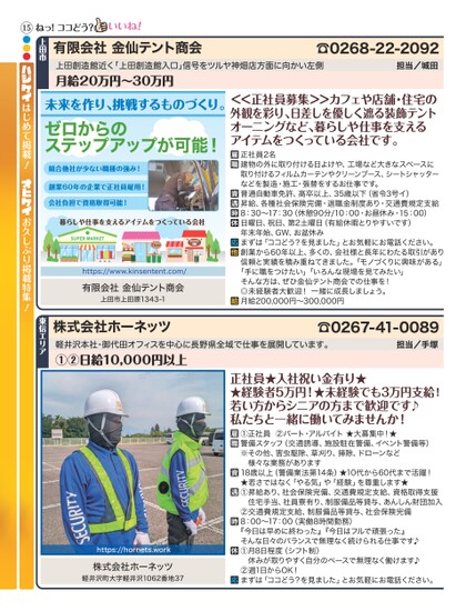 ☎0268-22-2092担当/城田未来を作り、挑戦するものづくり。ゼロからのステップアップが可能!競合他社が少ない職種の強み!創業60年の企業で正社員雇用!会社負担で資格取得可能!暮らしや仕事を支えるアイテムをつくっている会社https://www.kinsentent.com/有限会社金仙テント商会上田市上田原1343-1<<正社員募集>>カフェや店舗・住宅の外観を彩り、日差しを優しく遮る装飾テントオーニングなど、暮らしや仕事を支えるアイテムをつくっている会社です。正社員2名建物の外に取り付ける日よけや、工場など大きなスペースに取り付けるフィルムカーテンやクリーンブース、シートシャッターなどを製造・施工・張替をするお仕事です。普通自動車免許、高卒以上、35歳以下(省令3号イ)昇給、各種社会保険完備・退職金制度あり・交通費規定支給8:30〜17:30(休憩90分/10:00・お昼休み・15:00)日曜日、祝日、第2土曜日(有給休暇とりやすいです)年末年始、GW、お盆休みまずは「ココどう?を見ました」とお気軽にお電話ください。創業から60年以上、多くの、会社様と長年にわたる取引があり信頼と実績を積み重ねてきました。「モノづくりに興味がある」「手に職をつけたい」「いろんな現場を見てみたい」そんな方は、ぜひ金仙テント商会での仕事を!◎未経験者大歓迎!一緒に成長しましょう。月給200,000円〜300,000円☎0267-41-0089担当/手塚軽井沢本社・御代田オフィスを中心に長野県全域で仕事を展開しています。①②日給10,000円以上株式会社ホーネッツ東信エリア正社員★入社祝い金有り★★経験者5万円!★未経験でも3万円支給!若い方からシニアの方まで歓迎です♪私たちと一緒に働いてみませんか!①正社員②パート・アルバイト★大募集中!★警備スタッフ(交通誘導、施設駐在警備、イベント警備等)※その他、害虫駆除、草刈り、掃除、ドローンなど様々な業務があります18歳以上(警備業法第14条)★10代から60代まで活躍!★若さではなく「やる気」や「経験」を尊重します★①昇給あり、社会保険完備、交通費規定支給、資格取得支援住宅手当、社員寮有り、制服備品等貸与、あんしん財団加入②交通費規定支給、制服備品等貸与、社会保険完備8:00〜17:00(実働8時間勤務)『今日は早めに終わった』『今日はフルで頑張った』そんな日々のバランスで無理なく続けられる仕事です♪①月8日程度(シフト制)休みが取りやすく自分のペースで無理なく働けます♪②週1日からOK!まずは「ココどう?を見ました」とお気軽にお電話ください。https://hornets.work株式会社ホーネッツ軽井沢町大字軽井沢1062番地37上田創造館近く「上田創造館入口」信号をツルヤ神畑店方面に向かい左側月給20万円〜30万円有限会社金仙テント商会上田市ねっ!ココどう?15●●●はじめて掲載!お久しぶり掲載特集!