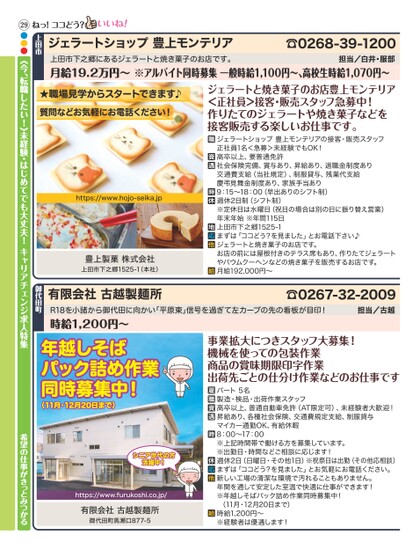 ☎0268-39-1200ジェラートショップ豊上モンテリア上田市上田市下之郷にあるジェラートと焼き菓子のお店です。月給19.2万円〜※アルバイト同時募集一般時給1,100円〜、高校生時給1,070円〜担当/白井・服部★職場見学からスタートできます♪質問などお気軽にお電話ください!https://www.hojo-seika.jp豊上製菓株式会社上田市下之郷1525-1(本社)ジェラートと焼き菓子のお店豊上モンテリア<正社員>接客・販売スタッフ急募中!作りたてのジェラートや焼き菓子などを接客販売する楽しいお仕事です。ジェラートショップ豊上モンテリアの接客・販売スタッフ正社員1名<急募>未経験でもOK!高卒以上、要普通免許社会保険完備、賞与あり、昇給あり、退職金制度あり交通費支給(当社規定)、制服貸与、残業代支給慶弔見舞金制度あり、家族手当あり9:15〜18:00(早出ありのシフト制)週休2日制(シフト制)※定休日は水曜日(祝日の場合は別の日に振り替え営業)年末年始※年間115日上田市下之郷1525-1まずは「ココどう?を見ました」とお電話下さい♪ジェラートと焼き菓子のお店です。お店の前には屋根付きのテラス席もあり、作りたてジェラートやバウムクーヘンなどの焼き菓子を販売するお店です。月給192,000円〜ねっ!ココどう?☎0267-32-2009担当/古越R18を小諸から御代田に向かい「平原東」信号を過ぎて左カーブの先の看板が目印!時給1,200円〜有限会社古越製麺所御代田町年越しそばパック詰め作業同時募集中!(11月・12月20日まで)シニア世代の方活躍中!https://www.furukoshi.co.jp/有限会社古越製麺所御代田町馬瀬口877-5事業拡大につきスタッフ大募集!機械を使っての包装作業商品の賞味期限印字作業出荷先ごとの仕分け作業などのお仕事ですパート5名製造・検品・出荷作業スタッフ高卒以上、普通自動車免許(AT限定可)、未経験者大歓迎!昇給あり、各種社会保険、交通費規定支給、制服貸与マイカー通勤OK、有給休暇8:00〜17:00※上記時間帯で働ける方を募集しています。※出勤日・時間などご相談に応じます!週休2日(日曜日・その他1日)※祝祭日は出勤(その他応相談)まずは「ココどう?を見ました」とお気軽にお電話ください。新しい工場の清潔な環境で汚れることもありません。年間を通して安定した室温で快適に仕事ができます!※年越しそばパック詰め作業同時募集中!(11月・12月20日まで)時給1,200円〜※経験者は優遇します!29●●●《今、転職したい!》未経験・はじめてでも大丈夫!キャリアチェンジ求人特集希望の仕事がきっとみつかる