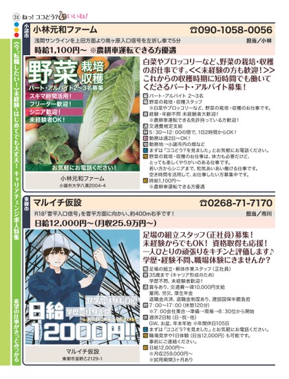 ☎090-1058-0056担当/小林白菜やブロッコリーなど、野菜の栽培・収穫のお仕事です。<<未経験の方も歓迎!>>これからの収穫時期に短時間でも働いてくださるパート・アルバイト募集!パート・アルバイト2〜3名野菜の栽培・収穫スタッフ※白菜やブロッコリーなど、野菜の栽培・収穫のお仕事です。経験・年齢不問未経験者大歓迎!※農耕車運転できる免許持っている方歓迎!交通費規定支給5:30〜12:00の間で、1日2時間からOK!勤務は週2日〜OK!勤務地→小諸市内の畑などまずは「ココどう?を見ました」とお気軽にお電話ください。野菜の栽培・収穫のお仕事は、体力も必要だけど、とっても楽しくやりがいのある仕事です。若い方からシニアまで、和気あいあい働ける仕事です。空き時間を活用して、お仕事したい方募集中です。時給1,100円〜※農耕車運転できる方優遇足場の組立スタッフ(正社員)募集!未経験からでもOK!資格取得も応援!一人ひとりの頑張りをキチンと評価します♪学歴・経験不問、職場体験にきませんか?足場の組立・解体作業スタッフ(正社員)35歳まで(キャリア形成のため)学歴不問、未経験者歓迎!賞与あり、交通費一律10,000円支給雇用、労災、厚生年金退職金共済、退職金制度あり、建設国保半額負担7:00〜17:00(休憩120分)※7:00会社集合→準備→現場→8:30位から開始週休2日制(日・祝・他)GW、お盆、年末年始※年間休日105日まずは「ココどう?を見ました」とお気軽にお電話ください。職場見学や1日体験(日当12,000円)も可能です。事前にご連絡ください。日給12,000円〜※月収259,000円〜※試用期間3ヶ月ありマルイチ仮設東御市滋野乙2129-1☎0268-71-7170担当/市川マルイチ仮設R18「菅平入口信号」を菅平方面に向かい、約400m右手です!日給12,000円〜(月収25.9万円〜)東御市お気軽にお電話ください!小林元和ファーム小諸市大字八満2004-4浅間サンラインを上田方面より南ヶ原入口信号を左折し車で5分時給1,100円〜※農耕車運転できる方優遇小林元和ファーム小諸市ねっ!ココどう?野菜栽培収穫パート・アルバイト2〜3名募集スキマ時間活用!フリーター歓迎!シニア歓迎!未経験者OK!31●●●《今、転職したい!》未経験・はじめてでも大丈夫!キャリアチェンジ求人特集希望の仕事がきっとみつかる