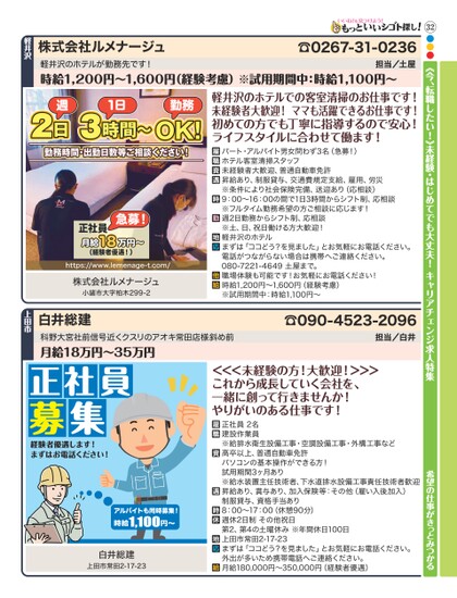 32●●●《今、転職したい!》未経験・はじめてでも大丈夫!キャリアチェンジ求人特集軽井沢のホテルが勤務先です!時給1,200円〜1,600円(経験考慮)※試用期間中:時給1,100円〜担当/土屋☎0267-31-0236株式会社ルメナージュ軽井沢2週日31日時間〜勤務時間・出勤日数等ご相談ください!勤務OK!急募!正社員18万円〜月給(経験者優遇!)https://www.lemenage-t.com/株式会社ルメナージュ小諸市大字柏木299-2軽井沢のホテルでの客室清掃のお仕事です!未経験者大歓迎!ママも活躍できるお仕事です!初めての方でも丁寧に指導するので安心!ライフスタイルに合わせて働ます!パート・アルバイト男女問わず3名(急募!)ホテル客室清掃スタッフ未経験者大歓迎、普通自動車免許昇給あり、制服貸与、交通費規定支給、雇用、労災※条件により社会保険完備、送迎あり(応相談)9:00〜16:00の間で1日3時間からシフト制、応相談※フルタイム勤務希望の方ご相談に応じます!週2日勤務からシフト制、応相談※土、日、祝日働ける方大歓迎!軽井沢のホテルまずは「ココどう?を見ました」とお気軽にお電話ください。電話がつながらない場合は携帯へご連絡ください。080-7221-4649土屋まで。職場体験も可能です!お気軽にお電話ください!時給1,200円〜1,600円(経験考慮)※試用期間中:時給1,100円〜<<<未経験の方!大歓迎!>>>これから成長していく会社を、一緒に創って行きませんか!やりがいのある仕事です!☎090-4523-2096担当/白井白井総建科野大宮社前信号近くクスリのアオキ常田店様斜め前月給18万円〜35万円上田市希望の仕事がきっとみつかる正社員2名建設作業員※給排水衛生設備工事・空調設備工事・外構工事など高卒以上、普通自動車免許パソコンの基本操作ができる方!試用期間3ヶ月あり※給水装置主任技術者、下水道排水設備工事責任技術者歓迎昇給あり、賞与あり、加入保険等:その他(雇い入後加入)制服貸与、資格手当あり8:00〜17:00(休憩90分)週休2日制その他祝日第2、第4の土曜休み※年間休日100日上田市常田2-17-23まずは「ココどう?を見ました」とお気軽にお電話ください。外出が多いため携帯電話へご連絡ください。月給180,000円〜350,000円(経験者優遇)経験者優遇します!まずはお電話ください!アルバイトも同時募集!時給1,100円〜白井総建上田市常田2-17-23