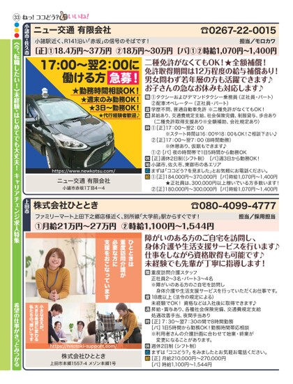 ☎0267-22-0015小諸駅近く、R141沿い「赤坂」の信号のそばです!担当/モロカワ[正]①18.4万円〜37万円②18万円〜30万円[パ]①②時給1,070円〜1,400円17:00〜翌2:00に働ける方急募!★勤務時間相談OK!★週末のみ勤務OK!★3日〜勤務OK!★代行経験者歓迎♪https://www.newkotsu.com/ニュー交通有限会社小諸市赤坂1丁目4ー4二種免許がなくてもOK!★全額補償!免許取得期間は12万程度の給与補償あり!男女問わず若年層の方も活躍できます♪お子さんの急なお休みも対応します♪①タクシーおよびデマンドタクシー乗務員(正社員・パート)②配車オペレーター(正社員・パート)学歴不問、普通自動車免許※二種免許がなくてもOK!昇給あり、交通費規定支給、社会保険完備、制服貸与、歩合あり(二種免許取得支援あり※全額補助、会社規定あり)①[正]17:00〜翌2:00※スタート時間は16:00や18:00もOK!ご相談下さい♪②[正]17:00〜翌7:00(8時間勤務)※休憩あり、仮眠もできます♪①②[パ]夜の時間帯で1日5時間から勤務OK[正]週休2日制(シフト制)[パ]週3日から勤務OK!小諸市、佐久市、東御市の各エリアまずは「ココどう?を見ました」とお気軽にお電話ください。①[正]184,000円〜370,000円[パ]時給1,070円〜1,400円★正社員は、300,000円以上稼いでいる方多数います!②[正]180,000円〜300,000円[パ]時給1,070円〜1,400円株式会社ひとときファミリーマート上田下之郷店様近く、別所線「大学前」駅からすぐです!①月給21万円〜27万円②時給1,100円〜1,544円☎080-4099-4777担当/採用担当障がいのある方のご自宅を訪問し、身体介護や生活支援サービスを行います♪仕事をしながら資格取得も可能です♪未経験でも先輩が丁寧に指導します!重度訪問介護スタッフ正社員2〜3名・パート3〜4名※障がいのある方のご自宅を訪問し身体介護や生活支援サービスを行っていただくお仕事です。18歳以上(法令の規定による)未経験でOK!資格などは入社後に取得できます♪昇給・賞与あり、各種社会保険完備、交通費規定支給処遇改善手当、夜間手当あり[正]7:30〜翌7:30の間で8時間勤務[パ]1日5時間から勤務OK!勤務時間帯応相談※利用者さんの介護計画に合わせて始業・終業が変更になることがあります。週休2日制(シフト制)まずは「ココどう?」をみましたとお気軽お電話ください。[正]月給210,000円〜270,000円[パ]時給1,100円〜1,544円ひとときは重度訪問介護が必要な方に支援をおこなっていますhttps://hitotoki-support.com/株式会社ひととき上田市本郷1557-4メゾン本郷1号小さな支えが、大きな希望に変わる私たちの「想い」ですねっ!ココどう?ニュー交通有限会社小諸市・佐久市上田市33●●●《今、転職したい!》未経験・はじめてでも大丈夫!キャリアチェンジ求人特集希望の仕事がきっとみつかる
