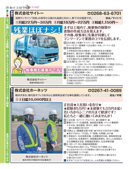 ねっ!ココどう?株式会社サイトー☎0268-63-6701浅間サンライン「別府」の信号から湯の丸高原に向かい、車で10分程度です。①月給22万円〜30万円②月給18万円〜22万円③時給1,150円〜担当/サイトウ残業ほぼナシ!まずは工場内で、廃棄物の種類や書類の作成方法を覚えます。その後、収集車に先輩が同乗してマンツーマンで業務のコツを伝授します。【正社員】①収集ドライバー②一般事務【パート】③一般事務※正社員3〜4名、パート1〜2名普通自動車免許①中型免許のある方歓迎!大型免許ある方優遇!昇給あり、賞与あり(実績による)、交通費規定支給制服貸与、社会保険完備、資格取得支援制度あり※正社員はさらに各種手当あり、家族手当、住宅手当【正社員】8:15〜17:00※①は6:15〜15:00の早出もOK!ご相談ください。【パート】9:00〜15:00※1日4時間勤務からOK!【正社員】隔週休2日制※土日(会社カレンダーあり)【パート】週3日勤務〜OK!まずは「ココどう?を見ました」とお気軽にお電話ください。①月給220,000円〜300,000円②月給180,000円〜220,000円③時給1,150円〜一般事務も募集中です!https://53-no-saito.com/株式会社サイトー東御市新張2087株式会社ホーネッツ軽井沢本社・御代田オフィスを中心に長野県全域で仕事を展開しています。①②日給10,000円以上☎0267-41-0089担当/手塚正社員★入社祝い金有り★★経験者5万円!★未経験でも3万円支給!若い方からシニアの方まで歓迎です♪私たちと一緒に働いてみませんか!①正社員②パート・アルバイト★大募集中!★警備スタッフ(交通誘導、施設駐在警備、イベント警備等)※その他、害虫駆除、草刈り、掃除、ドローンなど様々な業務があります18歳以上(警備業法第14条)★10代から60代まで活躍!★若さではなく「やる気」や「経験」を尊重します★①昇給あり、社会保険完備、交通費規定支給、資格取得支援住宅手当、社員寮有り、制服備品等貸与、あんしん財団加入②交通費規定支給、制服備品等貸与、社会保険完備8:00〜17:00(実働8時間勤務)『今日は早めに終わった』『今日はフルで頑張った』そんな日々のバランスで無理なく続けられる仕事です♪①月8日程度(シフト制)休みが取りやすく自分のペースで無理なく働けます♪②週1日からOK!まずは「ココどう?を見ました」とお気軽にお電話ください。https://hornets.work株式会社ホーネッツ軽井沢町大字軽井沢1062番地37東御市東信エリア39●●●《今、転職したい!》未経験・はじめてでも大丈夫!キャリアチェンジ求人特集希望の仕事がきっとみつかる