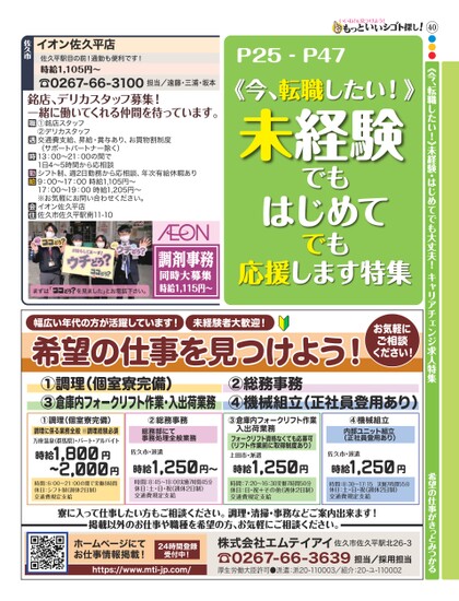 40●●●《今、転職したい!》未経験・はじめてでも大丈夫!キャリアチェンジ求人特集希望の仕事がきっとみつかる担当/遠藤・三浦・坂本銘店、デリカスタッフ募集!一緒に働いてくれる仲間を待っています。佐久平駅目の前!通勤も便利です!時給1,105円〜☎0267-66-3100イオン佐久平店佐久市①銘店スタッフ②デリカスタッフ交通費支給、昇給・賞与あり、お買物割制度(サポートパートナー除く)13:00〜21:00の間で1日4〜5時間から応相談シフト制、週2日勤務から応相談、年次有給休暇あり9:00〜17:00時給1,105円〜17:00〜19:00時給1,205円〜※お気軽にお問い合わせください。イオン佐久平店佐久市佐久平駅南11-10調剤事務同時大募集時給1,115円〜まずは「を見ました」とお電話下さい。P25-P47《今、転職したい!》未経験はじめてでもでも応援します特集幅広い年代の方が活躍しています!未経験者大歓迎!希望の仕事を見つけよう!お気軽にご相談ください!①調理(個室寮完備)③倉庫内フォークリフト作業・入出荷業務②総務事務④機械組立(正社員登用あり)①調理(個室寮完備)調理に係る業務全般※調理経験必須万座温泉(群馬県)・パート・アルバイト時給1,800〜2,000円円時間:6:00〜21:00の間で実働8時間休日:シフト制(週休2日制)交通費規定支給②総務事務総務部にて事務処理全般業務佐久市・派遣時給1,250円〜時間:8:45〜18:00実働7時間45分休日:土・日・祝(週休2日制)交通費規定支給③倉庫内フォークリフト作業入出荷業務フォークリフト資格なくても応募可(リフト作業前に取得制度あり)上田市・派遣時給1,250円時間:7:20〜16:30実働7時間50分休日:日・祝+その他(週休2日制)交通費規定支給④機械組立内部ユニット組立(正社員登用あり)佐久市・派遣時給1,250円時間:8:30〜17:15実働7時間55分休日:土・日・祝(週休2日制)交通費規定支給寮に入って仕事したい方もご相談ください。調理・清掃・事務などご案内出来ます!掲載以外のお仕事や職種を希望の方、お気軽にご相談ください。ホームページにてお仕事情報掲載!受付中!https://www.mti-jp.com/24時間登録株式会社エムテイアイ佐久市佐久平駅北26-3☎0267-66-3639厚生労働大臣許可●派遣:派20-110003/紹介:20-ユ-110002担当/採用担当