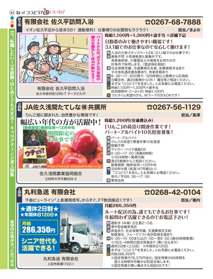 ☎0267-68-7888担当/きよの時給1,100円〜1,300円+諸手当※詳細下記日勤帯のみで働きやすい職場です!3人1組でのお仕事なので安心して働けます!入浴の介助スタッフパート2名(3人1組でのお仕事です)資格不問※有資格者も募集中です。実務者研修、介護福祉士の資格をお持ちの方好条件で採用します。(面談時応相談)社会保険完備、交通費規定支給、各種資格手当ありその他処遇改善加算あり、有給休暇あり8:30〜17:30の間で、1日5時間以上勤務から応相談日曜定休、週3日勤務からOK!曜日等ご相談ください。まずは「ココどう?を見ました」とお気軽にお電話ください。時給1,100円〜1,300円+諸手当試用期間中(1〜2ヶ月)時給1,100円フルタイム希望の方も、Wワークの方もOKです!パートさんは、お子さんや家庭の都合を優先して休みが取れます!有限会社佐久平訪問入浴佐久市岩村田1290-7ラークビル1Fイオン佐久平店から徒歩3分!通勤便利!仕事帰りのお買物もラクラク!ねっ!ココどう?有限会社佐久平訪問入浴JA佐久浅間たてしな○横共所りんご畑に囲まれた、自然豊かな環境です!幅広い年代の方が活躍中![勤務期間]随時採用〜12月中旬期間限定のお仕事です!☎0267-56-1129担当/島津時給1,200円(交通費込み)「りんご」の荷造り関連作業です!パート・アルバイト10名程度募集!パート・アルバイトりんごの荷造り関連作業10名程度経験不問マイカー・バイク通勤OK8:00〜17:00(実働8時間)※1日4時間〜勤務可能週3日勤務からご相談ください。勤務期間:随時採用〜12月中旬立科町牛鹿(県道147号線沿い)「ココどう?を見た」とお気軽にお電話ください。受付/平日8:30〜17:00果物出荷★週休2日制★★年間休日120日★月給286,350円シニア世代も活躍できる!丸利急送有限会社上田市長瀬1722-1☎0268-42-0104担当/堀内月給286,350円ルート配送の為、誰でもできるお仕事です!年齢問わず活躍できるのでお電話下さい!運転手(4t車)正社員2〜3名準中型自動車免許昇給あり、社会保険完備、交通費規定支給制服貸与、フォークリフト免許取得支援あり6:00〜15:00または21:00〜翌6:00(週40時間勤務)※1日3〜4時間の固定残業あり(無い日もあり)週休2日制(土日祝)※年間休日120日まずは「ココどう?を見ました」とお気軽にお電話ください。月給286,350円※固定残業代78,375円含む。固定残業の66時間を超える時間外労働分は別途支給します。※固定残業が無い働き方も相談OKです!千曲ビューライン「上長瀬南信号」からすぐ、FT物流様近くです!丸利急送有限会社上田市https://www.ja-sakuasama.iijan.or.jp/佐久浅間農業協同組合立科町大字牛鹿828-2佐久市立科町41●●●《今、転職したい!》未経験・はじめてでも大丈夫!キャリアチェンジ求人特集希望の仕事がきっとみつかる