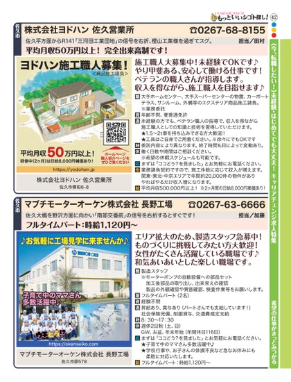 42●●●《今、転職したい!》未経験・はじめてでも大丈夫!キャリアチェンジ求人特集希望の仕事がきっとみつかる☎0267-68-8155担当/田村佐久平方面からR141「三河田工業団地」の信号を右折、樫山工業様を過ぎてスグ。平均月収50万円以上!完全出来高制です!株式会社ヨドハン佐久営業所佐久市ヨドハン施工職人募集!<商品施工請負>平均月収50研修中(2ヶ月)は日給8,000円補償あり!https://yodohan.jp万円以上!ホームページ職人紹介ページをぜひご覧ください株式会社ヨドハン佐久営業所佐久市横和6-8施工職人大募集中!未経験でOKです♪やり甲斐ある、安心して働ける仕事です!ベテランの職人さんが指導します。収入を得ながら、施工職人を目指せます♪大手ホームセンター、大手スーパーセンターの物置、カーポートテラス、サンルーム、外構等のエクステリア商品施工請負。※業務委託年齢不問、要普通免許未経験の方でも、ベテラン職人の指導で、収入を得ながら施工職人としての知識と技術を習得していただけます。★1.5〜2t車を持ち込みできる方大歓迎!★工具はご自身でご用意ください。※徐々にでもOKです委託内容により異なります。終了時間も日によって変動あり。働く日数や時間はご相談ください。※希望の休暇スケジュールも可能です。まずは「ココどう?を見ました」とお気軽にお電話ください。業務請負契約ですので、施工件数に応じて収入が増えます。関東・東北・中京エリアで年間約20,000件の物件がありやればやるだけ収入増になります。平均月収500,000円以上!※2ヶ月間の日給8,000円補償あり!佐久大橋を野沢方面に向かい「南部交番前」の信号を右折するとすぐです!フルタイムパート:時給1,120円〜担当/加藤☎0267-63-6666マブチモーターオーケン株式会社長野工場佐久市♪お気軽に工場見学に来ませんか♪子育て中のママさん多数活躍中♪https://okenseiko.comマブチモーターオーケン株式会社長野工場佐久市原578エリア拡大のため、製造スタッフ急募中!ものづくりに挑戦してみたい方大歓迎!女性がたくさん活躍している職場です♪和気あいあいとした楽しい職場です。製造スタッフ※モーターポンプの自動設備への部品セット加工後部品の取り出し、出来栄えの確認製品の外観確認や異音確認、検査作業等をお願いします。フルタイムパート(2名)経験不問昇給あり、賞与あり(パートさんでも支給しています!)社会保険完備、制服貸与、交通費規定支給8:30〜17:30週休2日制(土、日)GW、お盆、年末年始(年間休日116日)まずは「ココどう?を見ました」とお気軽にお電話ください。★子育て中のママさん多数活躍中♪★学校行事や、お子さんの体調不良など急なお休みにも柔軟に対応いたします。フルタイムパート:時給1,120円〜