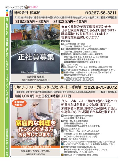 https://matsumoto-gumi.com/ねっ!ココどう?株式会社松本組☎0267-56-3211R142沿い「和子」の信号を東御市方面に向かい、最初のT字路を左折してすぐ左手です。担当/採用担当①月給25万円〜30万円②月給35万円〜40万円★★<社員の子育て応援宣言>★★仕事と家庭が両立できるより働きやすい職場環境づくりを目指しています♪福利厚生も充実しています♪正社員①土木作業員(2〜3名)②土木施工管理技士(2〜3名)①普通自動車免許※キャリア形成の為40歳以下②土木施工管理技士(1級または2級)昇給あり、賞与あり(実績による)、制服貸与家族手当、皆勤手当、各種手当あり、社会保険完備有給休暇あり、建設業退職金共済各種資格取得支援制度あり(全額支援!)7:00〜17:00完全週休2日制、GW、お盆、年末年始、年間休日120日まずは「ココどう?を見ました」とお気軽にお電話ください。社員の子育て応援をしており、子どもに関する行事など積極的な参加をすすめています!①月給250,000円〜300,000円②月給350,000円〜400,000円正社員募集株式会社松本組北佐久郡立科町大字田2820-1リカバリーアシストグループホームリカバリー(コーポ泉内)☎0268-75-8072R18東御市「田中」信号を田中駅方面に進み、田中駅前」信号を右折して100mほど進んだ左側時給1,061円※土日祝日:時給1,111円担当/採用担当未経験者大歓迎!家庭的な料理を料理作ってくださる方お待ちしています!※中高年の方でも活躍できるお仕事です合同会社リカバリーアシスト東御市新張1265-308グループホームにて障がい者6〜7名への朝食または夕食をつくるお仕事です。未経験者大歓迎、資格など必要ありません。中高年の方でも活躍できるお仕事です!障がい者への食事作り・家事援助※主に調理、室内清掃など年齢不問、未経験者大歓迎調理の資格必要ありません。※中高年の方でも活躍できるお仕事です。労災、交通費支給①6:30〜11:30②15:00〜20:00※交代制(シフト制)※ご相談に応じます※①もしくは②のみの勤務だけでも可週2〜3日勤務から応相談!グループホームリカバリー(東御市田中233-1コーポ泉内)まずは「ココどう?を見ました」とお気軽にお電話ください。地域生活援助を目的に設立しました。私たちと一緒に働いてくださる方お待ちしています。試用期間中にしっかりと学べます。時給1,061円※土日祝日:時給1,111円立科町東御市45●●●《今、転職したい!》未経験・はじめてでも大丈夫!キャリアチェンジ求人特集希望の仕事がきっとみつかる