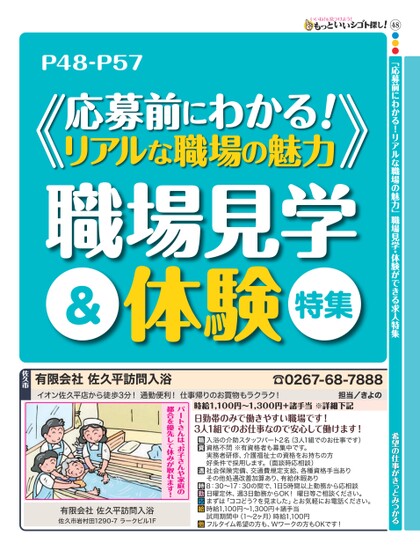 48●●●「応募前にわかる!リアルな職場の魅力」職場見学・体験ができる求人特集希望の仕事がきっとみつかるP48-P57応募前にわかる!リアルな職場の魅力職場見学体験&特集時給1,100円〜1,300円+諸手当※詳細下記日勤帯のみで働きやすい職場です!3人1組でのお仕事なので安心して働けます!入浴の介助スタッフパート2名(3人1組でのお仕事です)資格不問※有資格者も募集中です。実務者研修、介護福祉士の資格をお持ちの方好条件で採用します。(面談時応相談)社会保険完備、交通費規定支給、各種資格手当ありその他処遇改善加算あり、有給休暇あり8:30〜17:30の間で、1日5時間以上勤務から応相談日曜定休、週3日勤務からOK!曜日等ご相談ください。まずは「ココどう?を見ました」とお気軽にお電話ください。時給1,100円〜1,300円+諸手当試用期間中(1〜2ヶ月)時給1,100円フルタイム希望の方も、Wワークの方もOKです!パートさんは、お子さんや家庭の都合を優先して休みが取れます!有限会社佐久平訪問入浴佐久市岩村田1290-7ラークビル1F☎0267-68-7888担当/きよのイオン佐久平店から徒歩3分!通勤便利!仕事帰りのお買物もラクラク!有限会社佐久平訪問入浴佐久市