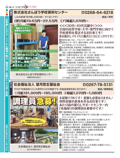 ☎0268-64-6218担当/市村株式会社さんぽう学校資料センター東御市しなの鉄道「田中駅」の目の前!すぐ近くです![契]月給19.6万円〜22.5万円[ア]時給1,070円〜通勤ラクラク!勤務地は田中駅前!<<<30代・40代活躍中!>>>全国の高等学校・大学・専門学校に向けて学校資料を発送するお仕事です!体を動かしイキイキと働きたい方にピッタリです♪◎体力を活かしてイキイキと働ける環境です♪人と触れ合うシゴトより体を適度に動かして働くことが好きだし、得意!というあなたに、ピッタリのお仕事です!https://company.sanpou-s.net/株式会社さんぽう学校資料センター東御市田中286-1契約社員(1名)、アルバイト(若干名)資料センター内で、資料の梱包、出荷、在庫管理、返送品整理などを担当していただきます。社会保険完備、有給休暇、交通費規定支給、車通勤可、駐車場完備9:00〜17:20(実働7時間20分)[契]土曜日の勤務時間9:00〜16:00[契]土曜月3回休み(日・祝・その他、暦通りです)GW、お盆・年末年始※年間休日115日[ア]週3日〜、1日5時間以上※時間帯応相談※夏期休暇、冬期休暇ありまずは「ココどう?を見ました」とお気軽にお電話ください。[契]月給196,000円〜225,000円※固定残業代20,110円〜23,090円※時間外手当は時間外労働の有無に関わらず固定残業代として支給し、15時間を超える場合は別途支給します。[ア]時給1,070円〜R142「布施温泉入口」の信号から2分程度です。布施温泉様手前にあります!①月給181,900円〜185,300円②時給1,070円〜1,080円担当/採用担当調理員急募!未経験でOKです!経験も必要ありません♪利用者様の食事を作るお仕事です♪あたり前の暮らしサポートセンター内「布施屋」の調理員を募集中です♪利用者様といっしょに楽しく料理をするお仕事です。https://www.yuugen-fukushikai.com/fuseya/index.html社会福祉法人望月悠玄福祉会佐久市布施769-1①臨時職員(フルタイムパート)★70歳まで契約更新が可能です!元気に働いてみませんか!②パートスタッフ調理員(朝、昼、夕食の調理、おやつ作りをお願いします)調理の資格必要ありません♪普通自動車免許①昇給あり、賞与あり、交通費規定支給、退職金共済各種社会保険完備、資格手当あり(調理師免許等)②昇給あり、交通費規定支給、各種社会保険完備資格手当あり(調理師免許等)①6:00〜15:00、10:00〜19:00(交代勤務)②6:00〜15:00①月8日〜11日(シフト制)※年間休日110日②週2日から勤務OKです!まずは「ココどう?を見ました」とお気軽にお電話ください。①月給181,900円〜185,300円②時給1,070円〜1,080円☎0267-78-5131社会福祉法人望月悠玄福祉会佐久市ねっ!ココどう?49●●●「応募前にわかる!リアルな職場の魅力」職場見学・体験ができる求人特集希望の仕事がきっとみつかる