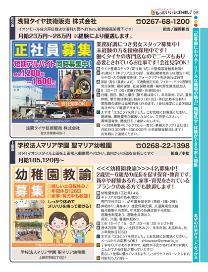 50●●●「応募前にわかる!リアルな職場の魅力」職場見学・体験ができる求人特集希望の仕事がきっとみつかる幼稚園教諭(正社員)4名キャリア形成の為40歳以下専門学校卒以上、幼稚園教諭免許(専修・1種・2種)昇給あり、賞与あり、社会保険完備、交通費規定支給、毎月調整手当支給、年末度に処遇改善手当支給、退職金制度あり、退職金共済加入育児、介護、看護休暇あり①8:15〜17:15②7:30〜16:30※シフト制週休2日制(嬉しい土日祝休み♪)、年末年始、お盆休み、他※年間休日126日まずは「ココどう?を見ました」とお気軽にお電話ください。メールからの応募もOK!shiawase@stmaria.jp丁寧なOJTがありますので、疑問や不安があればすぐに聞くことができる体制が整っています◎安心して仕事に慣れていけるよう、しっかりとフォローいたします。月給185,120円〜<<<幼稚園教諭>>>4名募集中!2歳児〜6歳児の成長を促す保育・教育です。新卒や経験ある方、家事・育児をされているブランクのある方でも歓迎します!幼稚園教諭募集◎嬉しい土日祝休み♪◎年間休日126日◎家事・育児中も歓迎!しっかり休めてメリハリを持って働ける!https://www.stmaria.jp学校法人マリア学園聖マリア幼稚園上田市常田2丁目2-1☎0267-68-1200担当/採用担当イオンモール佐久平店様より浅科方面へ約1km、新幹線高架橋下です!月給23万円〜28万円※経験により優遇します。浅間タイヤ技術販売株式会社佐久市正社員募集短期アルバイト同時募集中!1,200円時給1,600円〜(随時スタートから12月中旬〜下旬まで)(経験者優遇)会社見学OK!https://asama-tire.com浅間タイヤ技術販売株式会社佐久市塚原465-1業務好調につき男女スタッフ募集中!未経験の方を積極採用中です!働くタイヤの専門店なのでニーズもあり必要とされているお仕事です!会社見学OK!タイヤ整備スタッフ(正社員1名)※整備等経験者歓迎!45歳以下(キャリア形成の為)、普通自動車免許(AT限定不可)※中型・大型自動車免許、フォークリフト免許あれば尚可昇給・賞与(業績による)、交通費規定支給、マイカー・バイク通勤可労災保険、雇用保険、社会保険完備・福利厚生倶楽部加入8:30〜17:00(実働7時間・休憩90分)日曜、祝日、第2土曜日(繁忙期は除く)、年末年始、GW、夏季休暇、繁忙期は休日出勤あり(約10日・休日出勤手当有り)閑散期の連休は比較的長く休めます。(会社規定による休日は当社HPにて確認できます。)まずは「ココどう?を見ました」とお気軽にお電話ください。連絡後、履歴書をご郵送いただくか、ご持参ください。書類選考後、面接日をご連絡いたします。<<同時募集中!>>フロント・受付・事務スタッフ(正社員)月給180,000円〜200,000円※未経験者歓迎します!お気軽にご連絡ください。☎0268-22-1398担当/小松R141イオンスタイル上田を上田常入郵便局へ向かい、真向かいの道を左折してすぐ月給185,120円〜学校法人マリア学園聖マリア幼稚園上田市