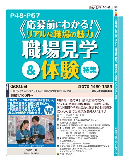 52●●●「応募前にわかる!リアルな職場の魅力」職場見学・体験ができる求人特集希望の仕事がきっとみつかるP48-P57応募前にわかる!リアルな職場の魅力職場見学体験&特集☎070-1459-1363担当/店舗採用担当GiGO上田上田バイパス沿い。マクドナルド上田バイパス店様すぐ近くです!時給1,100円〜上田市「学校やサークルの空き時間に働きたい」「仕事や趣味の合間に働きたい」「家事の合間に働きたい」「扶養範囲で働きたい」等履歴書あなたの都合で働けます♪不要https://www.gendagigo.jp/GiGO上田上田市上田1847-1履歴書不要です!簡単応募で安心!シフトの時間も調整可能!柔軟に対応!テスト期間や子どもの急な体調不良も相談OK安心して働ける環境を整えています♪パート・アルバイト(2〜3名)フロアスタッフ(遅番)未経験でOK!資格などは必要ありません!18歳以上(高校生不可)昇給あり、交通費規定支給、契約社員登用制度、制服貸与◆1日4時間〜OK!※22:00以降は時給25%UP(遅番)15:00〜23:30(金・土・祝前日以外)16:00〜24:30(金・土・祝前日)※基本パターン以外も相談で調整可♪◆週2日〜勤務OK!(シフトは自己申告制)※扶養内勤務OK※平日のみ/土日のみetc.相談OK!まずは「ココどう?」を見ましたとお気軽にお電話下さい♪履歴書不要!(平日10:00〜22:00)またはWebよりご応募下さい。時給1,100円〜