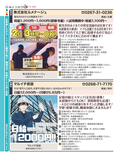 軽井沢のホテルが勤務先です!時給1,200円〜1,600円(経験考慮)※試用期間中:時給1,100円〜担当/土屋☎0267-31-0236株式会社ルメナージュ軽井沢ねっ!ココどう?2週日331日時間〜勤務OK!勤務時間・出勤日数等ご相談ください!急募!正社員18万円〜月給(経験者優遇!)https://www.lemenage-t.com/株式会社ルメナージュ小諸市大字柏木299-2軽井沢のホテルでの客室清掃のお仕事です!未経験者大歓迎!ママも活躍できるお仕事です!初めての方でも丁寧に指導するので安心!ライフスタイルに合わせて働ます!パート・アルバイト男女問わず3名(急募!)ホテル客室清掃スタッフ未経験者大歓迎、普通自動車免許昇給あり、制服貸与、交通費規定支給、雇用、労災※条件により社会保険完備、送迎あり(応相談)9:00〜16:00の間で1日3時間からシフト制、応相談※フルタイム勤務希望の方ご相談に応じます!週2日勤務からシフト制、応相談※土、日、祝日働ける方大歓迎!軽井沢のホテルまずは「ココどう?を見ました」とお気軽にお電話ください。電話がつながらない場合は携帯へご連絡ください。080-7221-4649土屋まで。職場体験も可能です!お気軽にお電話ください!時給1,200円〜1,600円(経験考慮)※試用期間中:時給1,100円〜足場の組立スタッフ(正社員)募集!未経験からでもOK!資格取得も応援!一人ひとりの頑張りをキチンと評価します♪学歴・経験不問、職場体験にきませんか?足場の組立・解体作業スタッフ(正社員)35歳まで(キャリア形成のため)学歴不問、未経験者歓迎!賞与あり、交通費一律10,000円支給雇用、労災、厚生年金退職金共済、退職金制度あり、建設国保半額負担7:00〜17:00(休憩120分)※7:00会社集合→準備→現場→8:30位から開始週休2日制(日・祝・他)GW、お盆、年末年始※年間休日105日まずは「ココどう?を見ました」とお気軽にお電話ください。職場見学や1日体験(日当12,000円)も可能です。事前にご連絡ください。日給12,000円〜※月収259,000円〜※試用期間3ヶ月ありマルイチ仮設東御市滋野乙2129-1☎0268-71-7170担当/市川マルイチ仮設R18「菅平入口信号」を菅平方面に向かい、約400m右手です!日給12,000円〜(月収25.9万円〜)東御市55●●●「応募前にわかる!リアルな職場の魅力」職場見学・体験ができる求人特集希望の仕事がきっとみつかる