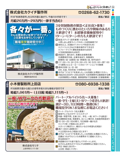 56●●●「応募前にわかる!リアルな職場の魅力」職場見学・体験ができる求人特集希望の仕事がきっとみつかるパート・アルバイト5名大募集!接客やレジなどのサービススタッフ年齢・学歴不問、主婦(夫)、学生、一般、Wワークも歓迎!交通費規定支給、制服貸与、おいしい賄付き、社員登用制度あり10:00〜20:00の間で、1日3時間〜働ける方※シフト制・ご相談に応じます!※ガッツリ稼ぎたい、働きたいなどの希望も応相談!週2〜3日から勤務OK!※土日祝のみもご相談に応じます!まずは「ココどう?を見ました」とお気軽にお電話ください。店舗はつながりにくいため携帯までご連絡ください。担当森田まで未経験の方でも皆で協力してサポートします。お子さんお持ちのママさんでも時間帯など相談ください。平日:時給1,061円〜土日祝:時給1,111円〜https://www.ogiso-seifunjo.com/株式会社モリタ上田市常入1-11-59☎080-6938-1338担当/森田小木曽製粉所上田店R18長野方面から踏入の信号手前大きな看板が目印です時給1,061円〜(土日祝:時給1,111円〜)上田市一般・Wワークの方歓迎!おいしい賄付きです!あいた時間を有効に活用しよう!パート・アルバイト5名〜大募集!一般・学生・主婦(夫)・Wワーク希望も大歓迎!週2〜3日、1日3時間〜勤務OK!職場見学OK!お気軽にお電話ください!製造スタッフ(成形業務)※正社員※押し出し成型ラインでのホース成型業務です高校以上、30歳まで(キャリア形成のため)※パソコン入力などの基本操作ができる方※フォークリフト運転技能者あれば尚可※玉掛技能者あれば尚可昇給あり、賞与あり、各種社会保険完備交通費規定支給、企業年金あり、制服貸与結婚祝い金・出産祝い金・新築祝い金、他手当あり①7:00〜15:30②15:00〜23:30③23:00〜翌7:00※1週間ごとに③→②→①のローテーションでの勤務週休2日制(土・日・他)GW、お盆、年末年始※年間休日113日まずは「ココどう?を見ました」とお気軽にお電話ください。月給200,000円〜290,000円※試用期間中は勤続給手当無※試用期間2ヶ月程度、業務習得まで日勤勤務(交替勤務無)各々が一番。そんな意味合いを持つ「カクイチ」3交替制勤務の製造<正社員>募集!ものづくりに携わりたい方や興味のある方大歓迎です!未経験者積極採用中!Iターン・Uターンの方も大歓迎です!☎0268-62-1730担当/渡辺株式会社カクイチ製作所R18「牧家西信号」を立科方面に曲がり、千曲川の手前です!月給20万円〜29万円(一律手当含む)東御市ご応募をお待ちしています!職場見学随時受付中!お電話お待ちしていますhttps://www.kaku-ichi.co.jp株式会社カクイチ製作所東御市加沢443