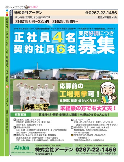 ☎0267-22-1456担当/総務部小山株式会社アーデンJR小海線「三岡駅」より徒歩5分です!①月給18万円〜22万円②日給8,488円〜小諸市ねっ!ココどう?業務好調につき募集名名46正社員契約社員ホクト株式会社のグループ企業食品製造メーカーとして衛生的な生産ラインで高品質なレトルト食品を製造しています!応募前の工場見学可!未経験の方でも大丈夫!お気軽にお問い合わせください!正社員4名・契約社員6名大募集!未経験の方でも大丈夫!募集要項[正社員]生産スタッフ3名[正社員]資材手配スタッフ(事務)1名[契約社員]生産スタッフ6名普通自動車免許[正]18歳〜30歳まで(深夜業務あり・キャリア形成の為)[契]18歳〜(深夜業務がある為)昇給あり、賞与あり、社会保険完備、制服貸与交通費規定支給、深夜手当あり、マイカー通勤可[正]のみ:家族・住宅・役職手当あり、退職金制度あり①8:00〜17:00②17:00〜翌2:00※1週間ごとのシフト制[契]②だけの勤務または①②のシフトでもOK!週休2日制(土日)、GW、お盆、年末年始有給休暇等、その他当社休日表による※年間休日115日[正]月給180,000円〜220,000円※昇給あり![契]日給8,488円〜※昇給あり!ホクト株式会社のグループ企業株式会社アーデン0267-22-1456「ココどう?を見ました」とお気軽にお電話ください。受付/月〜金曜日8時〜17時担当/総務部小山小諸市森山66-159●●●時代をリードする!ものづくり工場・製造ワーク求人特集!おうちでココどう!https://cocodou.info