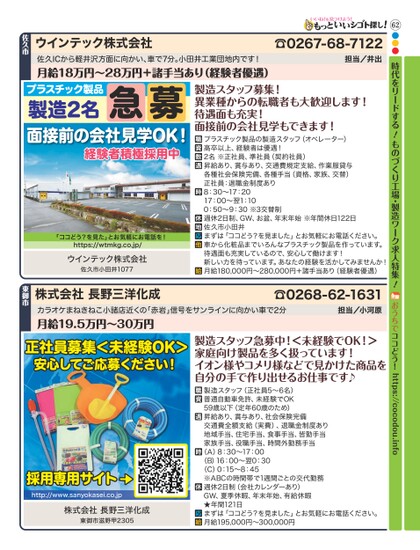 62●●●時代をリードする!ものづくり工場・製造ワーク求人特集!おうちでココどう!https://cocodou.info製造スタッフ募集!異業種からの転職者も大歓迎します!待遇面も充実!面接前の会社見学もできます!プラスチック製品の製造スタッフ(オペレーター)高卒以上、経験者は優遇!2名※正社員、準社員(契約社員)昇給あり、賞与あり、交通費規定支給、作業服貸与各種社会保険完備、各種手当(資格、家族、交替)正社員:退職金制度あり8:30〜17:2017:00〜翌1:100:50〜9:30※3交替制週休2日制、GW、お盆、年末年始※年間休日122日佐久市小田井まずは「ココどう?を見ました」とお気軽にお電話ください。車から化粧品までいろんなプラスチック製品を作っています。待遇面も充実しているので、安心して働けます!新しい力を待っています。あなたの経験を活かしてみませんか!月給180,000円〜280,000円+諸手当あり(経験者優遇)☎0267-68-7122担当/井出佐久ICから軽井沢方面に向かい、車で7分。小田井工業団地内です!月給18万円〜28万円+諸手当あり(経験者優遇)ウインテック株式会社佐久市プラスチック製品急募製造2名面接前の会社見学OK!経験者積極採用中「ココどう?を見た」とお気軽にお電話を!https://wtmkg.co.jp/ウインテック株式会社佐久市小田井1077☎0268-62-1631担当/小河原カラオケまねきねこ小諸店近くの「赤岩」信号をサンラインに向かい車で2分月給19.5万円〜30万円株式会社長野三洋化成東御市正社員募集<未経験OK>安心してご応募ください!製造スタッフ急募中!<未経験でOK!>家庭向け製品を多く扱っています!イオン様やコメリ様などで見かけた商品を自分の手で作り出せるお仕事です♪製造スタッフ(正社員5〜6名)普通自動車免許、未経験でOK59歳以下(定年60歳のため)昇給あり、賞与あり、社会保険完備交通費全額支給(実費)、退職金制度あり地域手当、住宅手当、食事手当、皆勤手当家族手当、役職手当、時間外勤務手当(A)8:30〜17:00(B)16:00〜翌0:30(C)0:15〜8:45※ABCの時間帯で1週間ごとの交代勤務週休2日制(会社カレンダーあり)GW、夏季休暇、年末年始、有給休暇★年間121日まずは「ココどう?を見ました」とお気軽にお電話ください。月給195,000円〜300,000円採用専用サイトhttp://www.sanyokasei.co.jp株式会社長野三洋化成東御市滋野甲2305