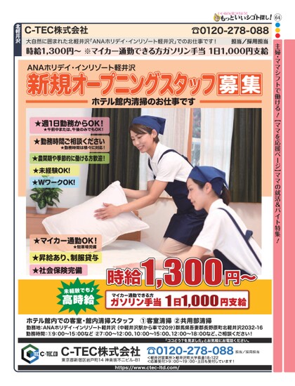 ●●●64主婦・ママシフトで働ける!【ママを応援ページ】ママの就活&バイト特集!担当/採用担当大自然に囲まれた北軽井沢「ANAホリデイ・インリゾート軽井沢」でのお仕事です!時給1,300円〜※マイカー通勤できる方ガソリン手当1日1,000円支給☎0120-278-088C-TEC株式会社北軽井沢ANAホリデイ・インリゾート軽井沢新規オープニングスタッフホテル館内清掃のお仕事です募集★週1日勤務からOK!★午前中または、午後のみでもOK!★勤務時間ご相談ください★勤務時間は様々に対応!★農閑期や季節的に働ける方歓迎!★未経験OK!★WワークOK!★マイカー通勤OK!★駐車場完備★昇給あり、制服貸与★社会保険完備未経験でも♪高時給時給1,300円〜マイカー通勤できる方ガソリン手当日円支給11,000ホテル館内での客室・館内清掃スタッフ①客室清掃②共用部清掃勤務地:ANAホリデイ・インリゾート軽井沢(中軽井沢駅から車で20分)群馬県吾妻郡長野原町北軽井沢2032-16勤務時間:①9:00〜15:00など②7:00〜12:00、10:00〜15:00、12:00〜18:00など、ご相談ください!C-TEC株式会社東京都新宿区岩戸町14神楽坂不二ビル-B1☎0120-278-088<軽井沢営業所>軽井沢町大字長倉18-122<応募受付>9:00〜19:00・土日も受付しています!担当/採用担当「ココどう?を見ました」とお気軽にお電話ください。https://www.ctec-ltd.com/
