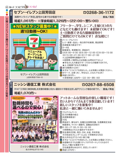 ☎0268-36-1172担当/浅田セブン‐イレブン上田芳田店上田市●●●65ねっ!ココどう?!フルタイムですが、お仕事はこんな雰囲気勤務時間も選べるので安心!残業はほとんどナシ!休日もしっかりとれるので、メリハリをもって働けます!アットホームな雰囲気!ニッシン通信工業株式会社佐久市中込3713-145アットホームな雰囲気の楽しい職場です!若い人からママさんまで多数活躍しています!新しいスタッフを募集中!私達と一緒に働いてみませんか!フルタイムパート圧力計機器の組立未経験者歓迎!10名昇給あり、賞与あり、各種社会保険完備、交通費規定支給制服貸与、マイカー通勤可、退職金共済あり8:00〜17:00、9:00〜16:00※時間帯はどちらか選択ができます!完全週休2日制、祝日、GW、お盆、年末年始その他会社カレンダーによる※年間休日125日佐久市中込3713-145(新工場)まずは「ココどう?を見ました」とお気軽にお電話ください。未経験の方でも先輩スタッフがサポートしてくれるので安心して働ける環境です!正社員登用もあるので、安定しています!時給1,070円〜浅間サンライン「芳田」信号から車で5分程度です!時給1,061円〜※深夜時給1,326円〜(22:00〜翌5:00)★NEWスタッフ募集中!★週1日勤務〜OK!フリーター、学生、シニア、主婦(夫)の方どなたでも働けます!未経験でOKです!土・日勤務できる方積極採用中!ご質問だけでもOKです!お気軽に!リニューアルオープンしたキレイなお店!セブン‐イレブン上田芳田店上田市芳田1799-10パート・アルバイトレジ・接客・品出し・発注等予約業務、商品管理未経験者大歓迎です!3〜4名制服貸与、車通勤OK、昇給あり(A)6:00〜9:00(B)6:00〜12:00(C)9:00〜15:00(D)15:00〜21:00(E)17:00〜21:00※上記時間帯を募集中です!※時間帯、ご質問などお気軽にお問合せ下さい♪★学生さんも大歓迎です!夕方からの勤務でOKです。★土・日勤務できる方大歓迎♪週1日勤務からOK!まずは「ココどう?を見ました」とお気軽にお電話ください。Wワーク、主婦(夫)、学生など、どなたでもOK!時給1,061円〜※深夜時給1,326円〜(22:00〜翌5:00)ニッシン通信工業株式会社☎0267-88-6508R141「三河田工業団地南」を双葉印刷様に向かい最初の十字路を左折し坂戸クリニック様目の前です。時給1,070円〜担当/井出主婦・ママシフトで働ける!【ママを応援ページ】ママの就活&バイト特集佐久市