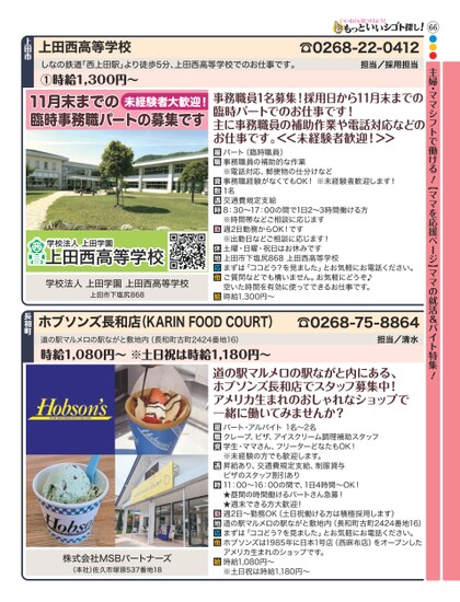 ●●●66主婦・ママシフトで働ける!【ママを応援ページ】ママの就活&バイト特集!☎0268-22-0412担当/採用担当しなの鉄道「西上田駅」より徒歩5分、上田西高等学校でのお仕事です。①時給1,300円〜上田西高等学校上田市11月末までの未経験者大歓迎!臨時事務職パートの募集です事務職員1名募集!採用日から11月末までの臨時パートでのお仕事です!主に事務職員の補助作業や電話対応などのお仕事です。<<未経験者歓迎!>>パート(臨時職員)事務職員の補助的な作業※電話対応、郵便物の仕分けなど事務職経験がなくてもOK!※未経験者歓迎します!1名交通費規定支給8:30〜17:00の間で1日2〜3時間働ける方※時間帯などご相談に応じます週2日勤務からOK!です※出勤日などご相談に応じます!土曜・日曜・祝日はお休みです上田市下塩尻868上田西高等学校まずは「ココどう?を見ました」とお気軽にお電話ください。ご質問などでも構いません。お気軽にどうぞ♪空いた時間を有効に使ってできるお仕事です。時給1,300円〜学校法人上田学園上田西高等学校学校法人上田学園上田西高等学校上田市下塩尻868☎0268-75-8864担当/清水ホブソンズ長和店(KARINFOODCOURT)道の駅マルメロの駅ながと敷地内(長和町古町2424番地16)時給1,080円〜※土日祝は時給1,180円〜長和町道の駅マルメロの駅ながと内にある、ホブソンズ長和店でスタッフ募集中!アメリカ生まれのおしゃれなショップで一緒に働いてみませんか?パート・アルバイト1名〜2名クレープ、ピザ、アイスクリーム調理補助スタッフ学生・ママさん、フリーターどなたもOK!※未経験の方でも歓迎します。昇給あり、交通費規定支給、制服貸与ピザのスタッフ割引あり11:00〜16:00の間で、1日4時間〜OK!★昼間の時間働けるパートさん急募!★週末できる方大歓迎!週2日〜勤務OK(土日祝働ける方は積極採用します)道の駅マルメロの駅ながと敷地内(長和町古町2424番地16)まずは「ココどう?を見ました」とお気軽にお電話ください。ホブソンズは1985年に日本1号店(西麻布店)をオープンしたアメリカ生まれのショップです。時給1,080円〜※土日祝は時給1,180円〜株式会社MSBパートナーズ(本社)佐久市塚原537番地18